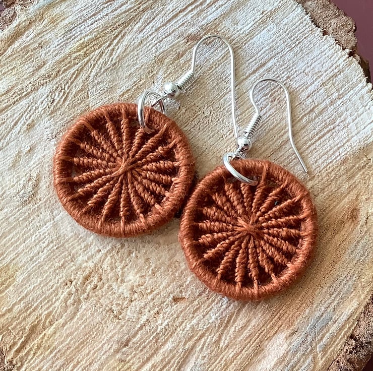 These earrings have been made by winding Cotton Perle thread around a metal ring to form intricate patterns. Each ring measures 2cm and hangs from silver plated earwires.