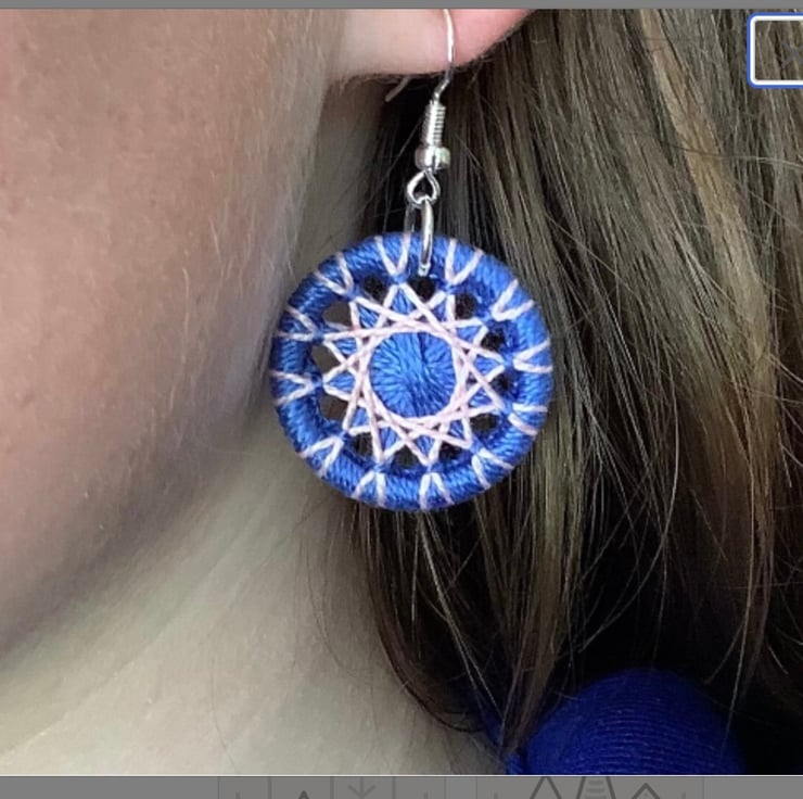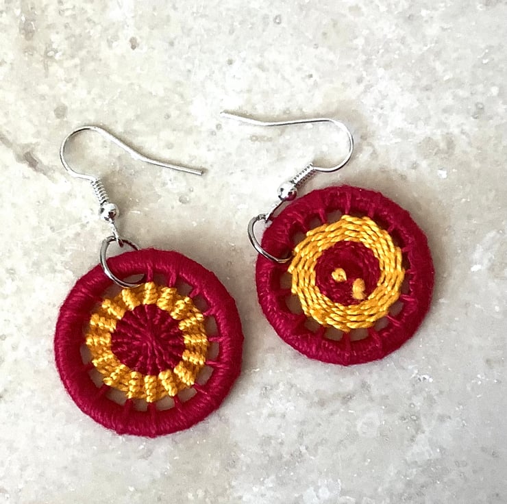 These earrings have been made by winding Cotton Perle thread around a metal ring. Each ring measures 2.5cm and hangs from silver plated earwires.