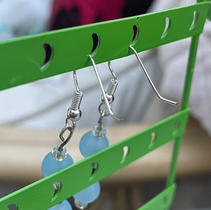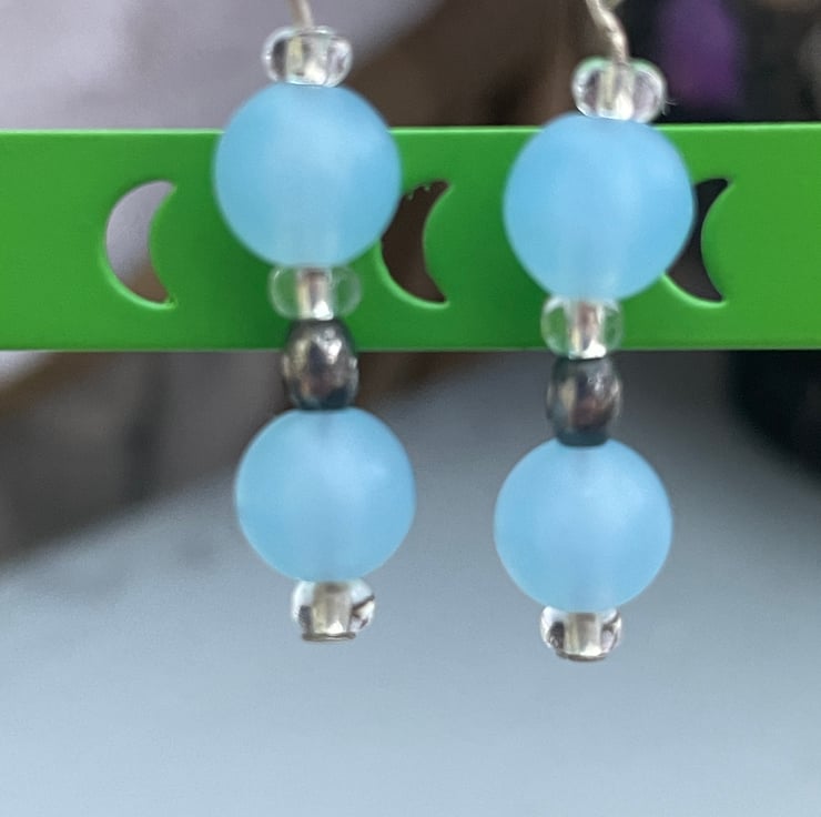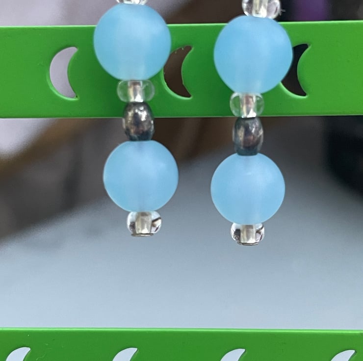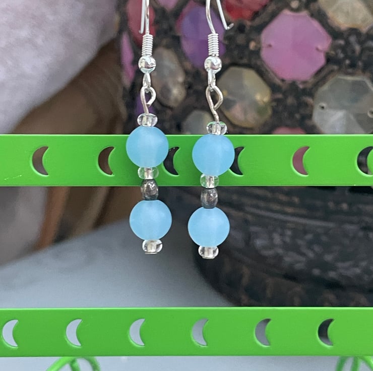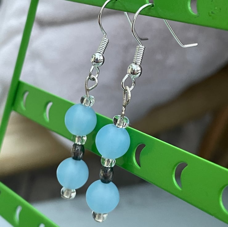 A pretty pair of blue beaded earrings. These earrings have a 4cm drop and are on silver coloured shepherds hook ear wires. The ear wires are hypoallergenic and safe to wear. The earrings have 2 frosted icy blue beads which are spaced with clear glass seed beads and an oval steel grey bead. They are pretty and easy to wear, lightweight and a lovely, casual addition to you wardrobe.
