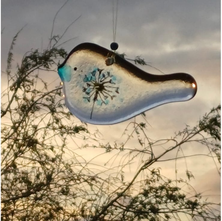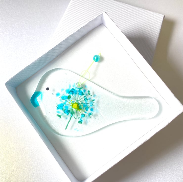 Prettty dandelion design in blue on a hanging bird that can be placed inside or outside your home . Perfect little gift too which comes in a white presentation box .