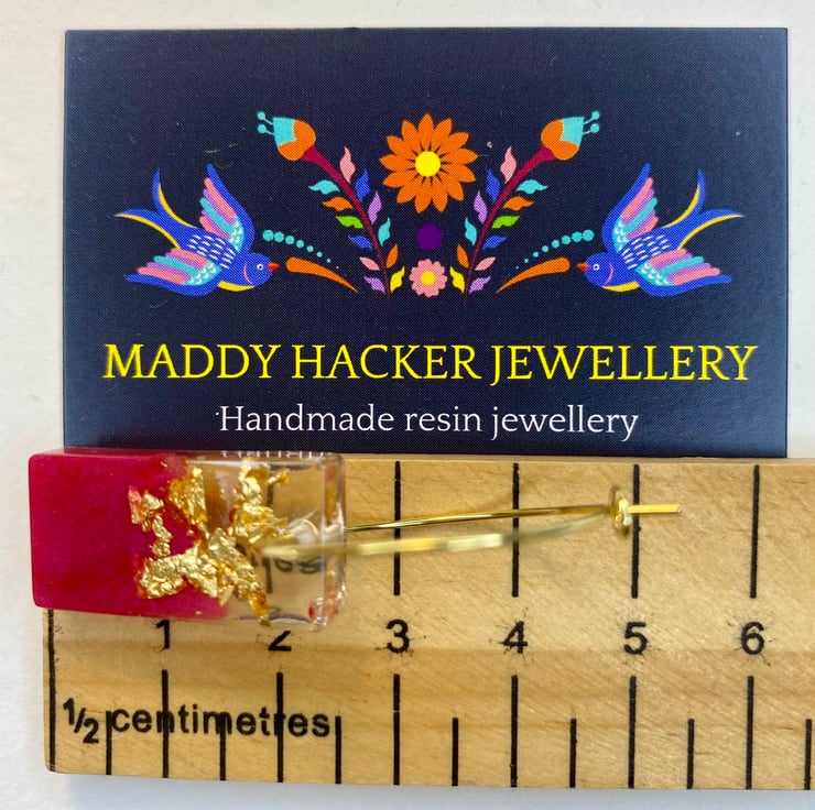 The 18k gold plated hoops are 2.5cm in diameter and the resin rectangle is 2.5cm long. The total drop length is 5cm.