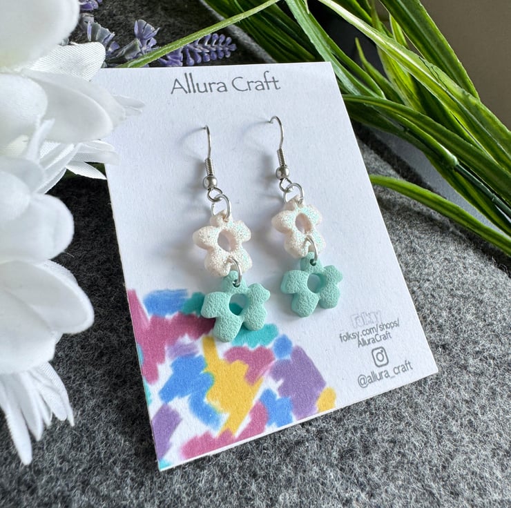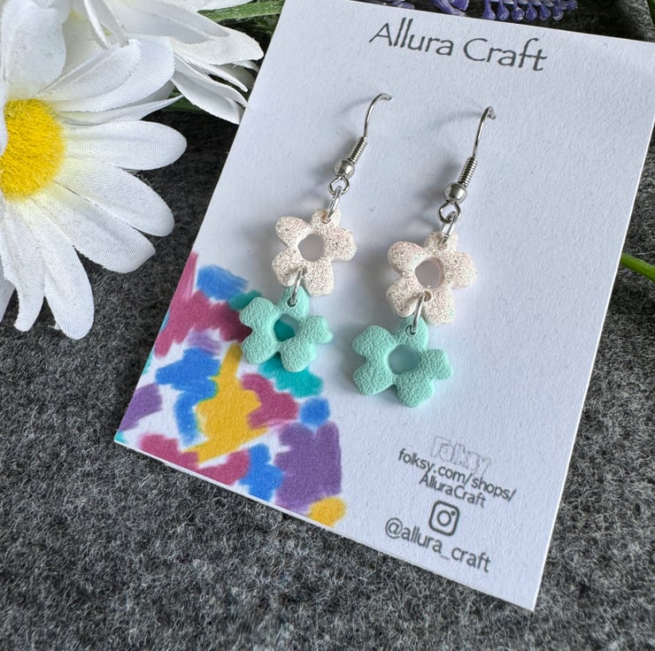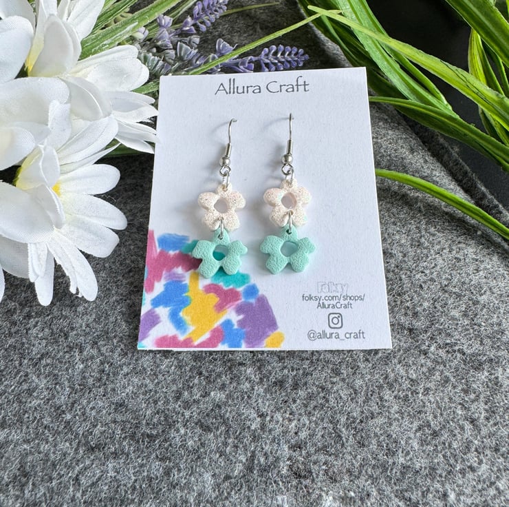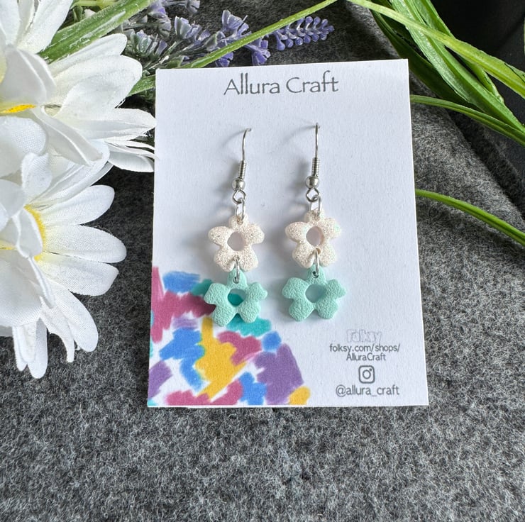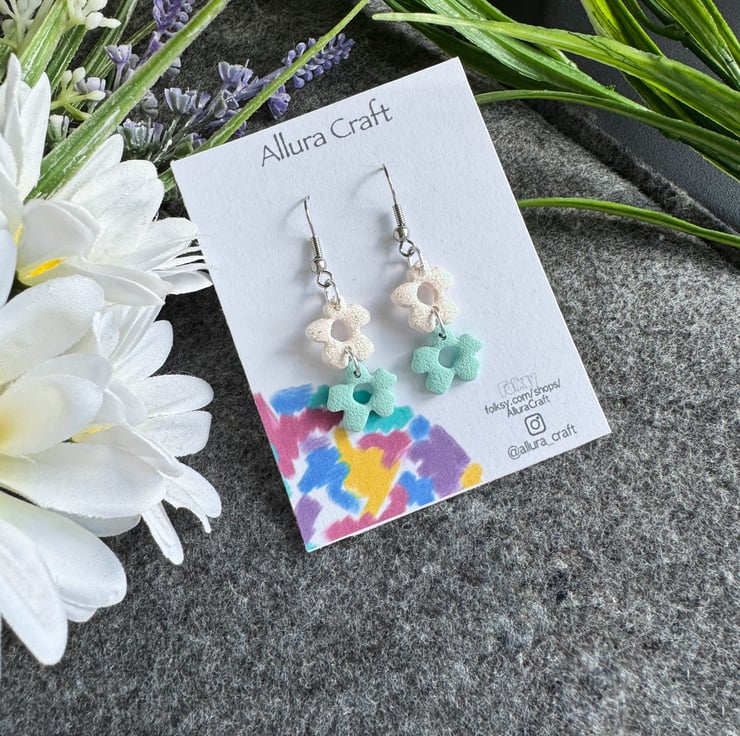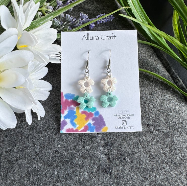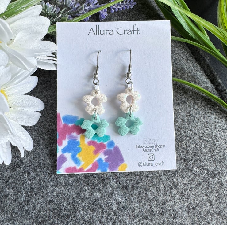 Second is made from a minty green hued and textured flower, swinging from a hypoallergenic surgical steel ear wire.