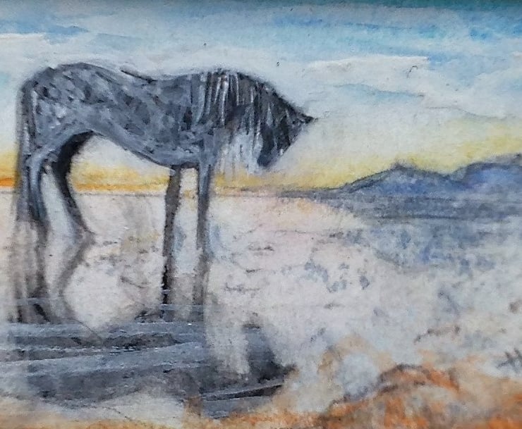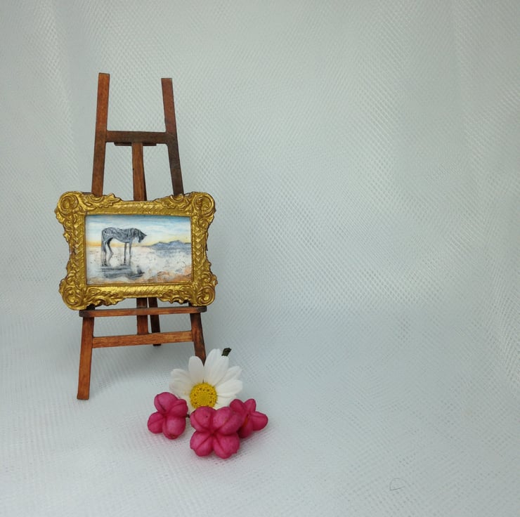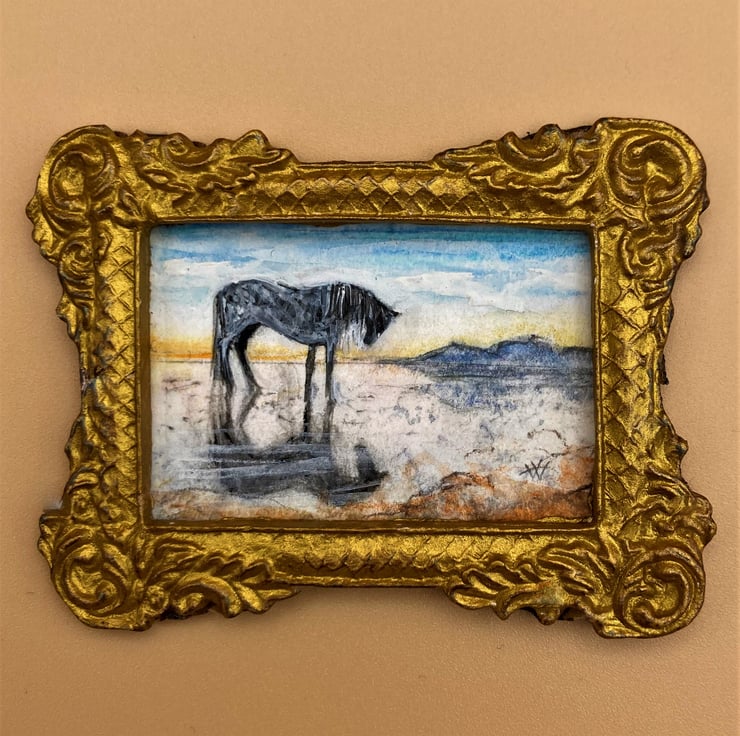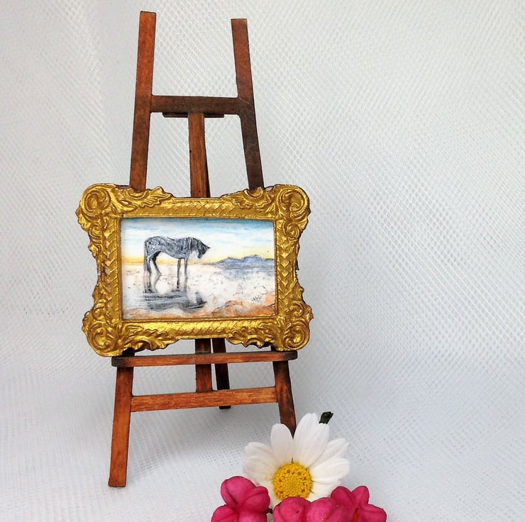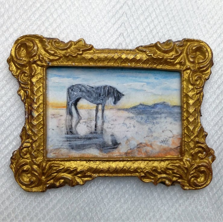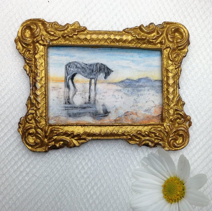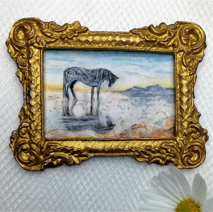 This tiny miniature painting (only the size of a large postage stamp) is a doll house scale landscape of a horse on a beach at sunset. The evening light and the horses shadow are reflected in the damp silvery sand. Distant mountains stand out against the glow of the dusk. It is an original watercolour painted by me