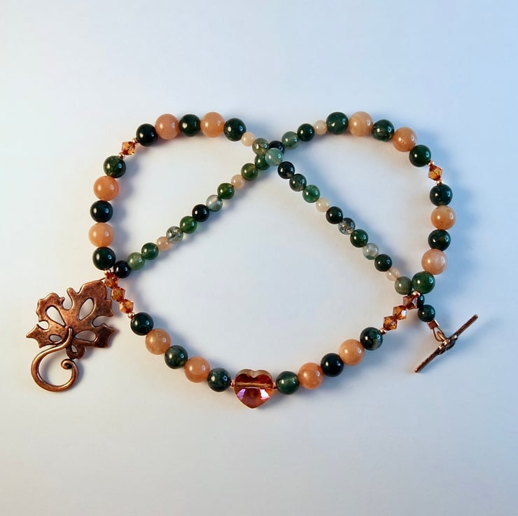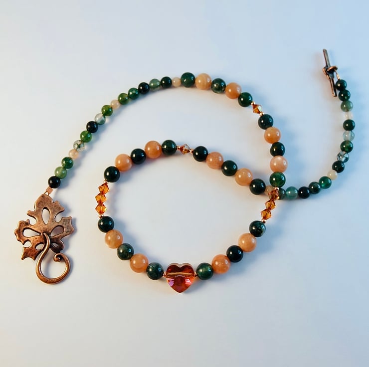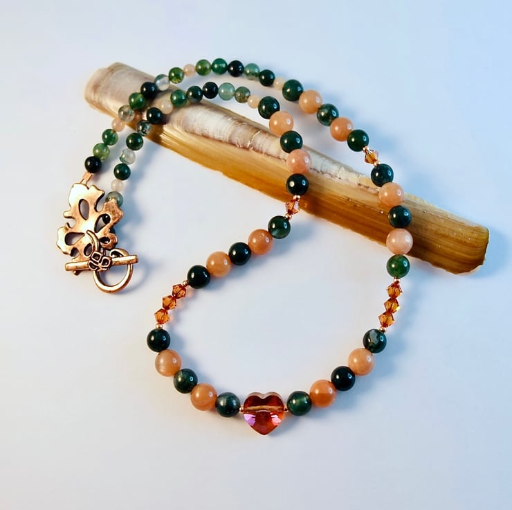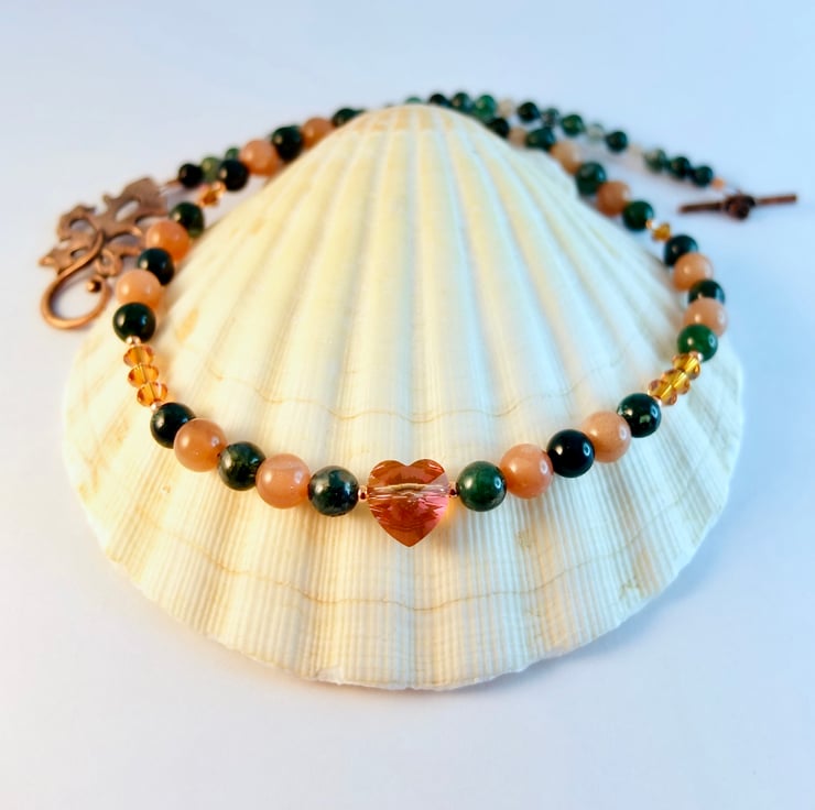 Sparkly necklace featuring a beautiful 10mm Austrian crystal heart in the colour 'crystal copper' set between 6mm Sunstone and Moss Agate beads embellished with four 4mm sparkly Austrian crystal bicones in the same colour as the heart.