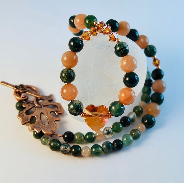 The Sunstone beads are light peach colour with a waxy sheen, and the Moss Agate beads are deep forest green amid clear patches.
