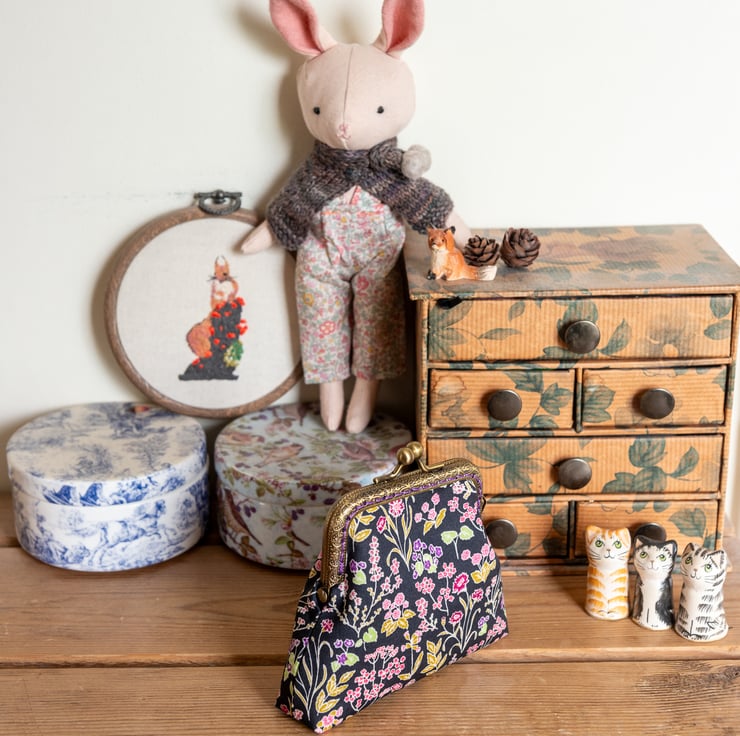 I've made the purse with a beautiful and delicate Liberty Tana Lawn print called 'Tess and Rosa' inspired by tapestries seen at Mount Stewart and The Burrell Collection. Traditionally, primrose symbolises spring, first love, romance intoxication and attraction, while heather represents passion. Cornflower symbolises virtue, with cowslip representing pensiveness.