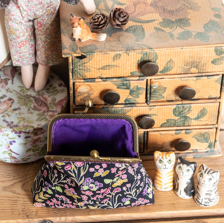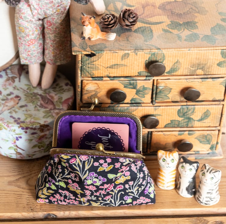 The engraved metal frame of the purse is an antique bronze colour and I've hand stitched it into place using a perle cotton to co-ordinate with the purple lining and the purple of the flowers in the print.
