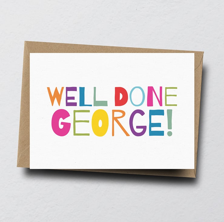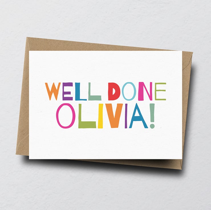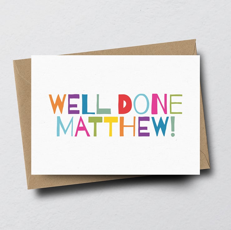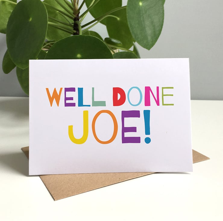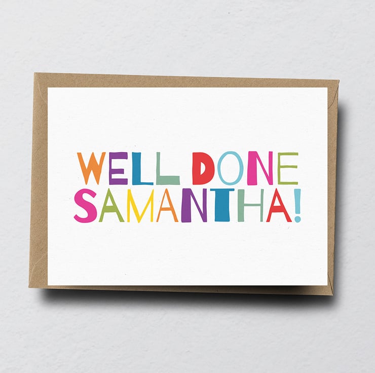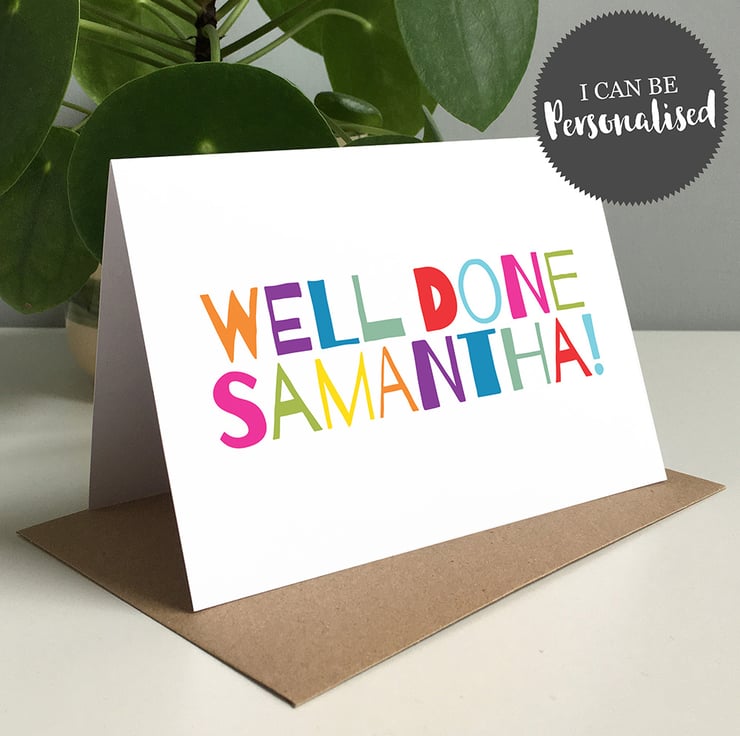 Say well done with this eco-friendly A6 personalised handmade card. To make your own bespoke card just enter the recipient's name in the box provided.