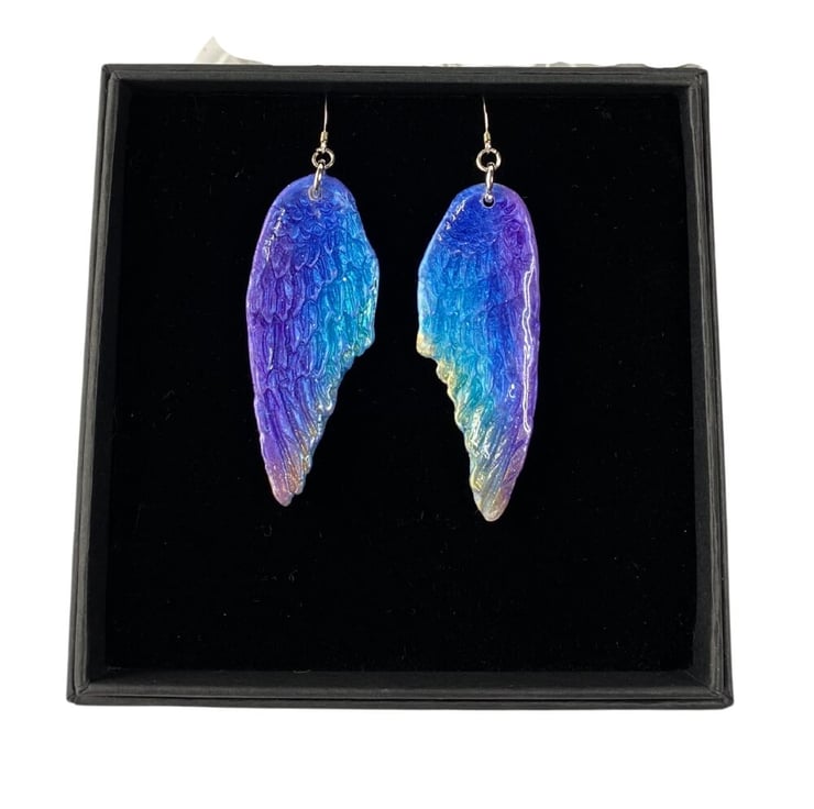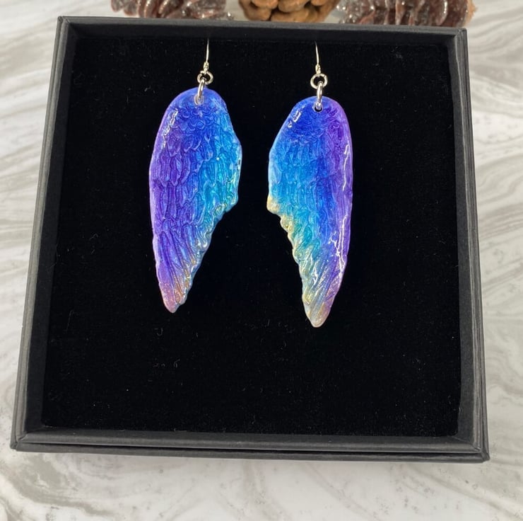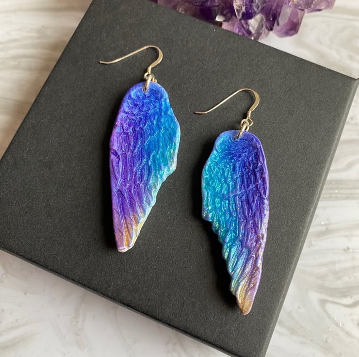 Angel wing feather statement earrings polymer clay and resin on sterling silver. These stunning and ethereal angel wing earrings form part of my spiritual and celestial jewellery collection. Each angel wing shaped piece is hand made from polymer clay and then I individually hand paint all the different shimmery mica powder colours onto the white polymer clay. Colours range from deep purple, royal blue, turquoise and gold.