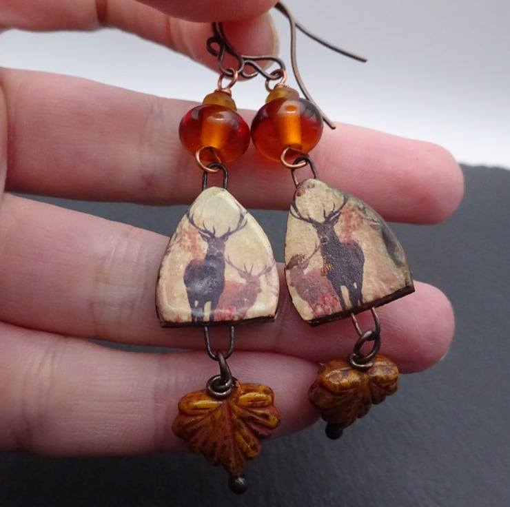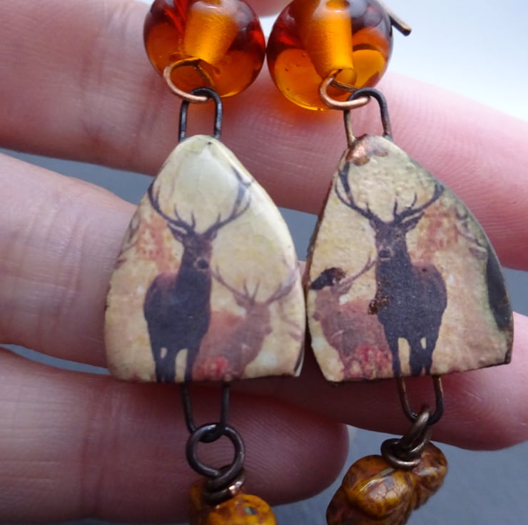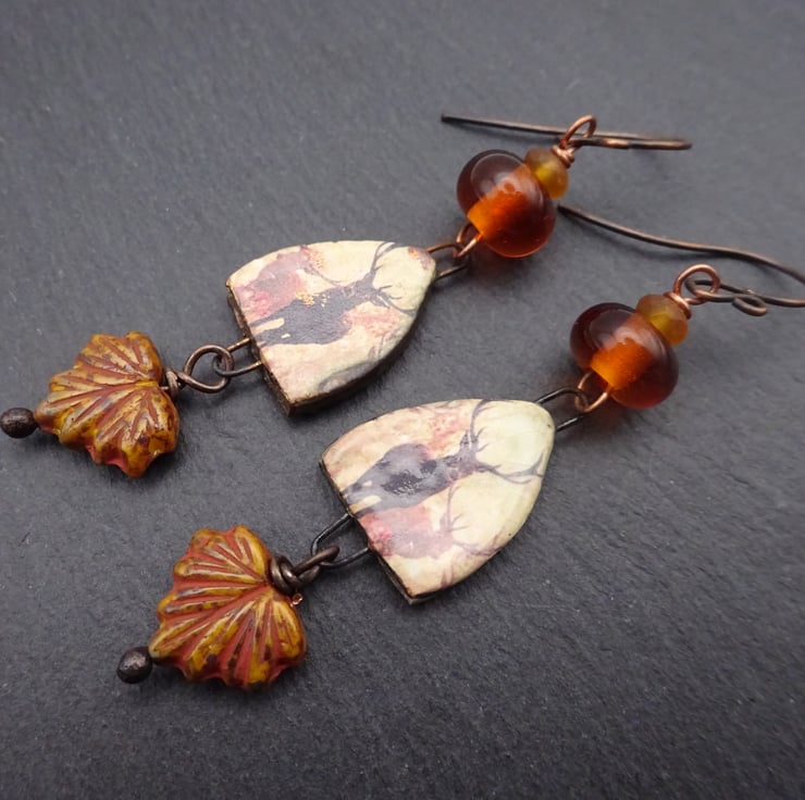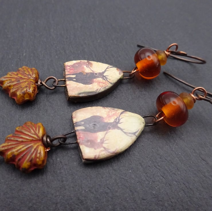 A pair of earrings made with handmade copper ear wires, handmade lampwork amber glass beads, handmade ceramic connectors with the image of a deer and Czech glass leaf beads.