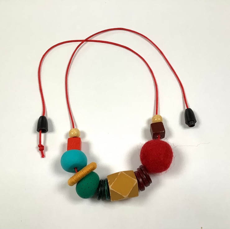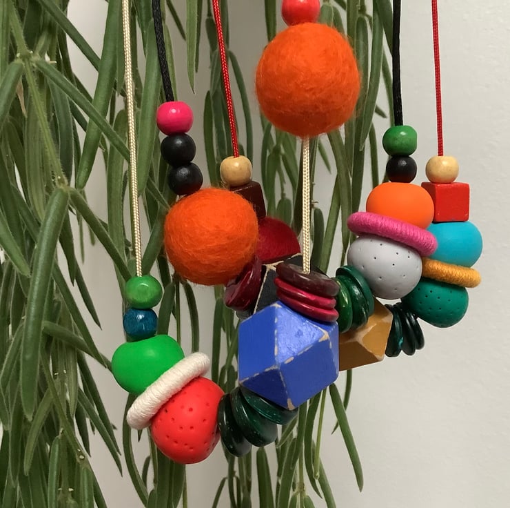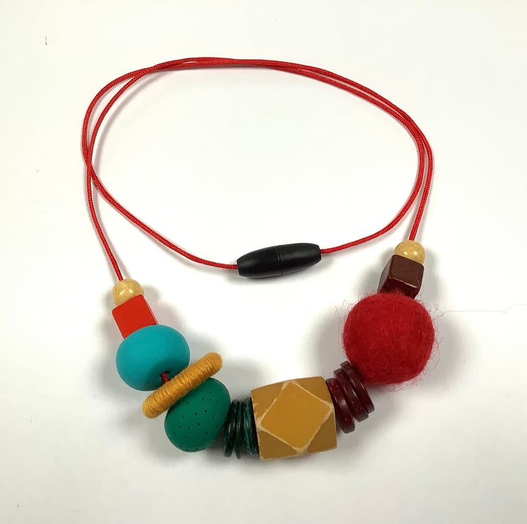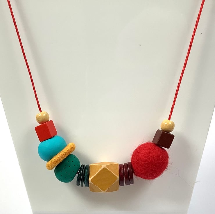 The necklace comprises wooden, felt and polymer beads and a cotton covered metal ring. The largest bead is 2cm.