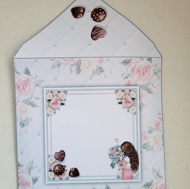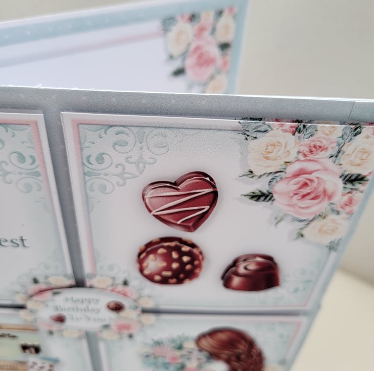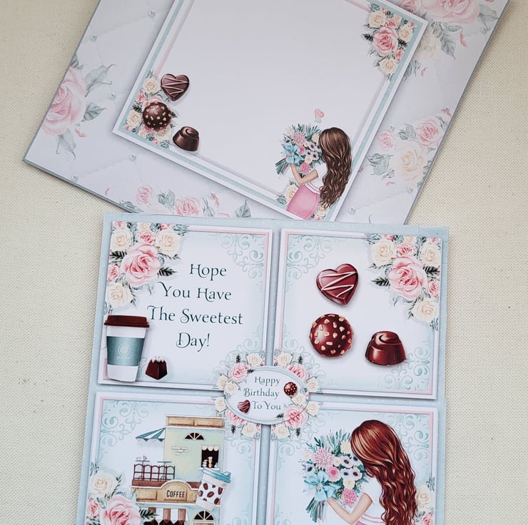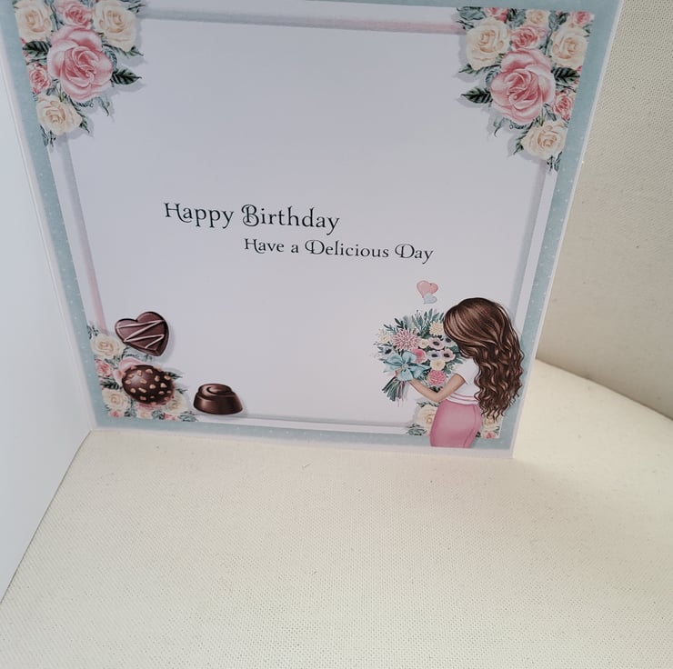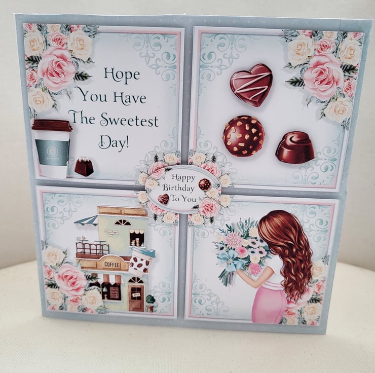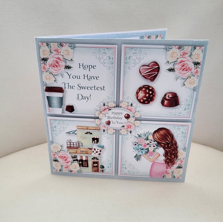 Each square is raised with foam pads to add dimension. The chocolates and the coffee cup have then been hand cut and raised again with foam pads. The Insert has the message Happy birthday, have a delicious day. ( if you would like a blank insert instead please message me)