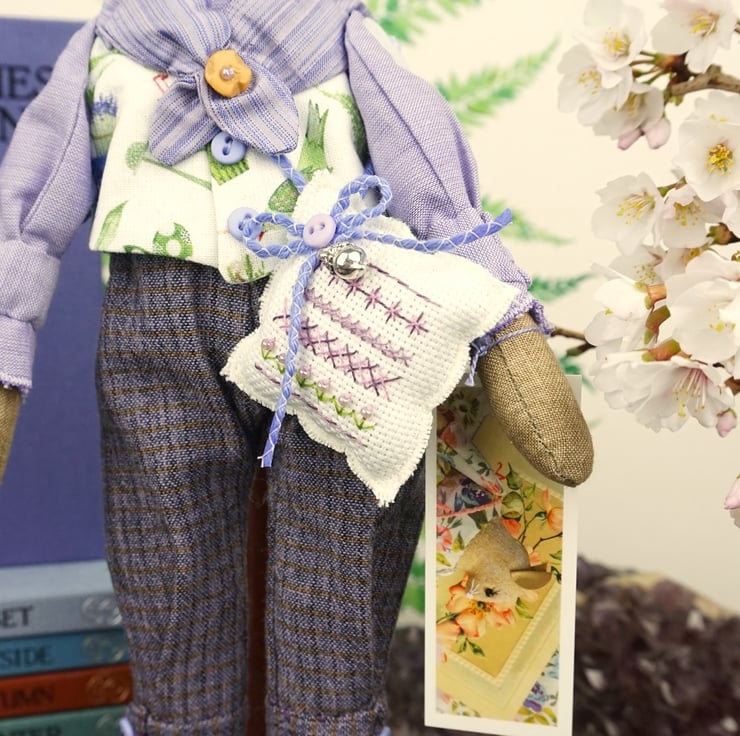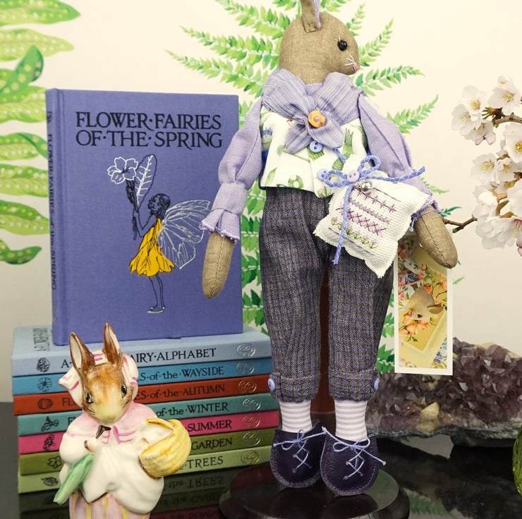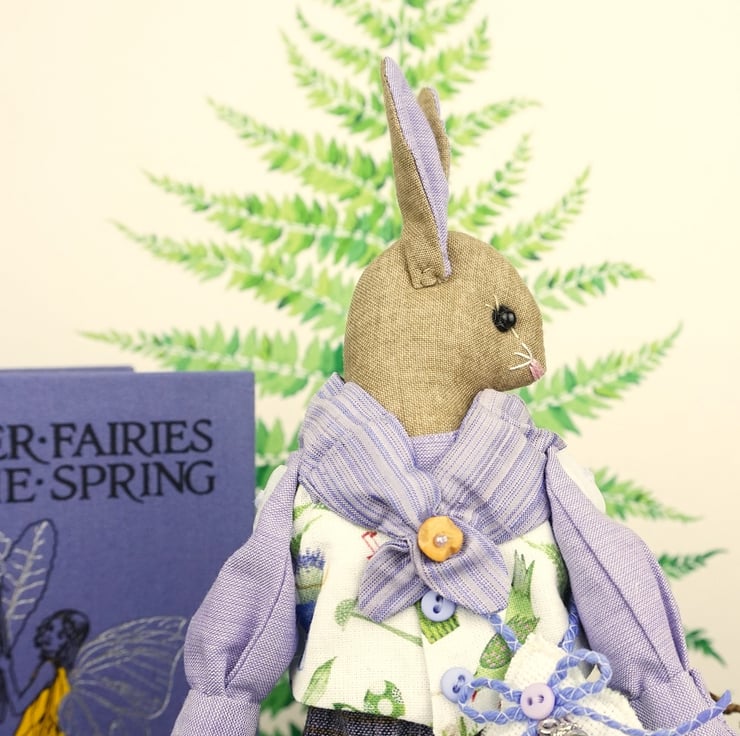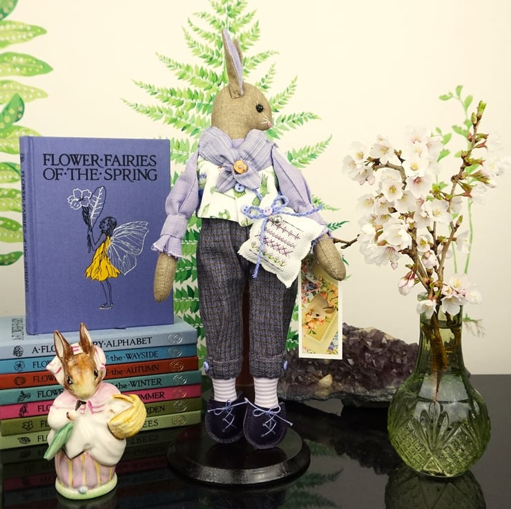 This little spring bunny is dressed in such a lovely Acufactum print with a white ground with pansies and violas wildflowers flowing over his waistcoat, teamed with lavender shot cotton shirt and purple yarn dyed plus fours..