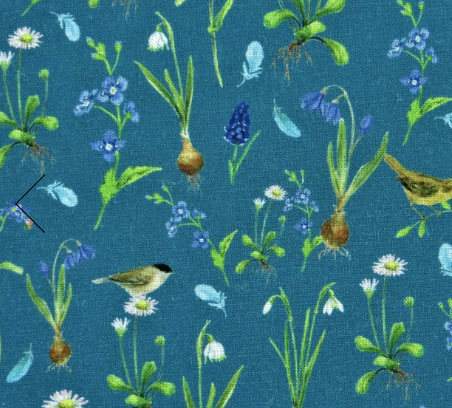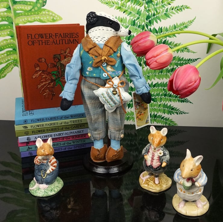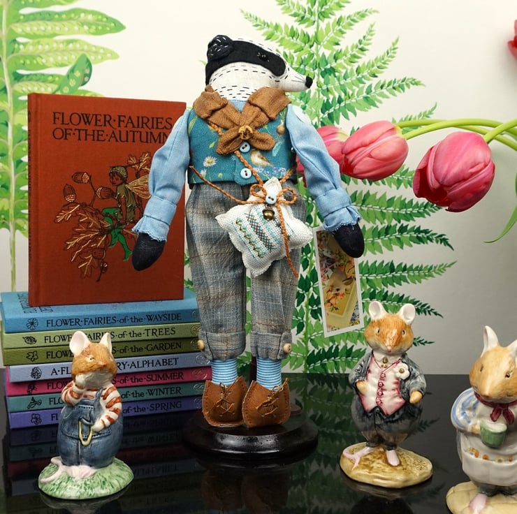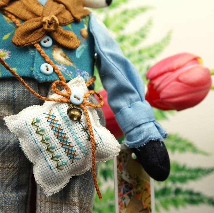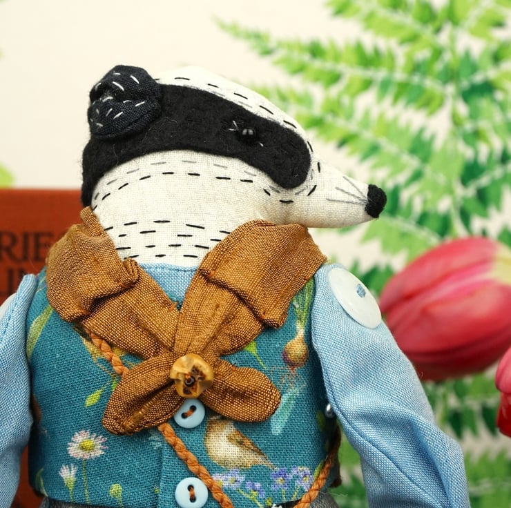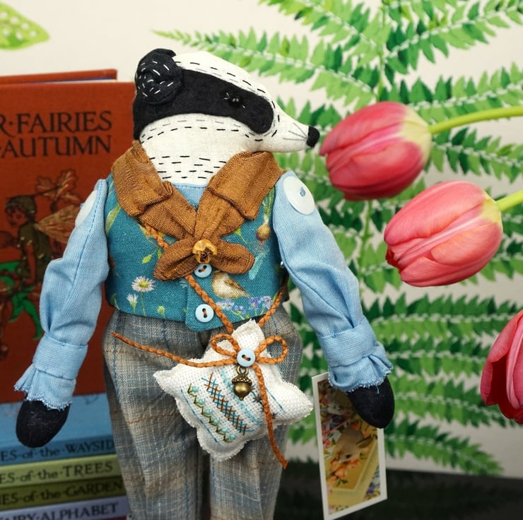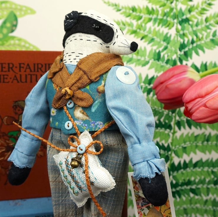 Harold is a tiny badger boy dressed in a lovely Acufactum cotton wiatcoat, with a blue ground and lots of tiny birds and spring bulbs, the fabric is called Heralds of Spring . This print is just lovely with bulbs bursting into flower. He has rosemary in his stuffing with a tigers eye crystal to his heart, hand embroidered features and a little embroidered tail. He is finished with tiny buttons, plus fours and little leather shoes.