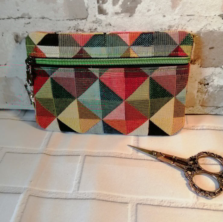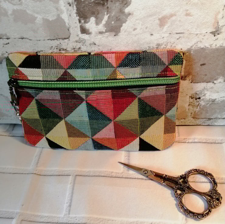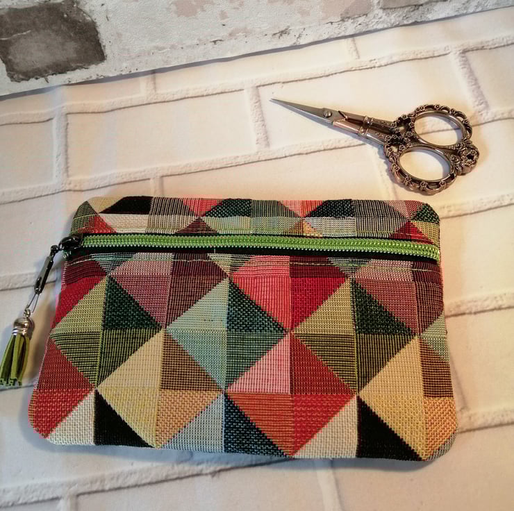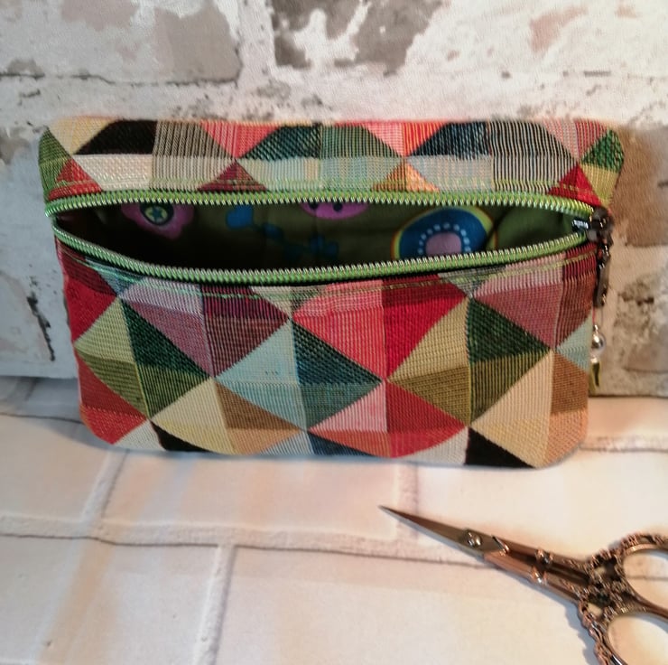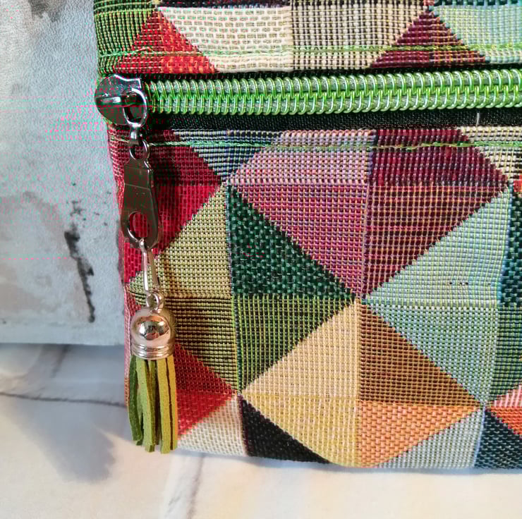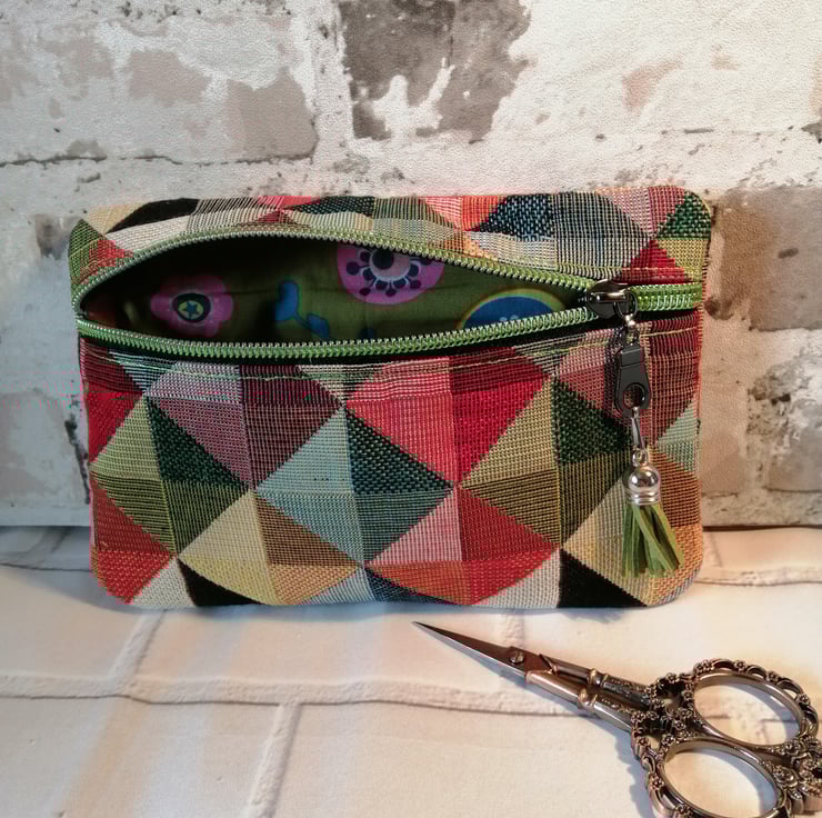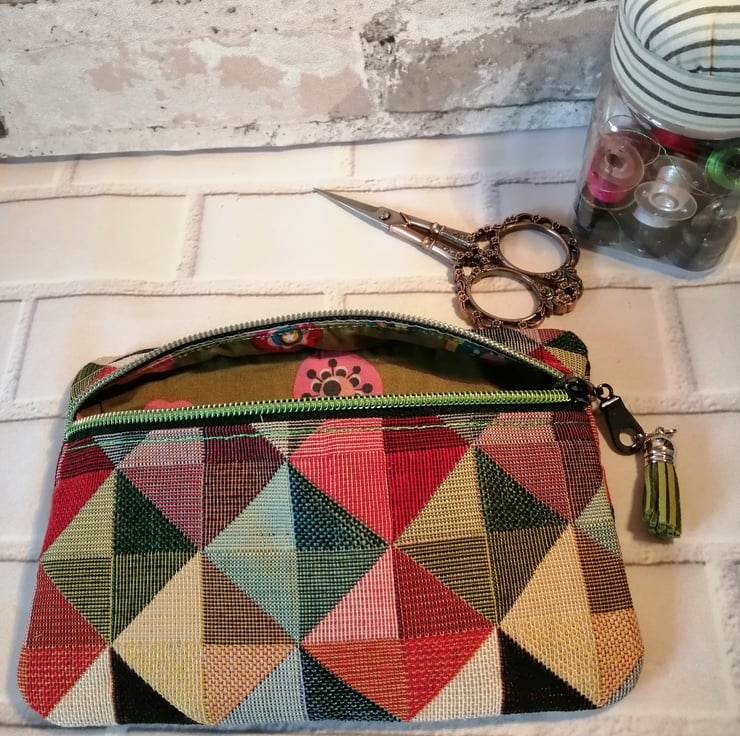 This make up/cosmetic bag is made in a wonderful multicoloured furnishing fabric which makes it quite sturdy. It's fully lined in a 100% cotton and has a gleaming green zip fastening with a green tassel on the zip pull.