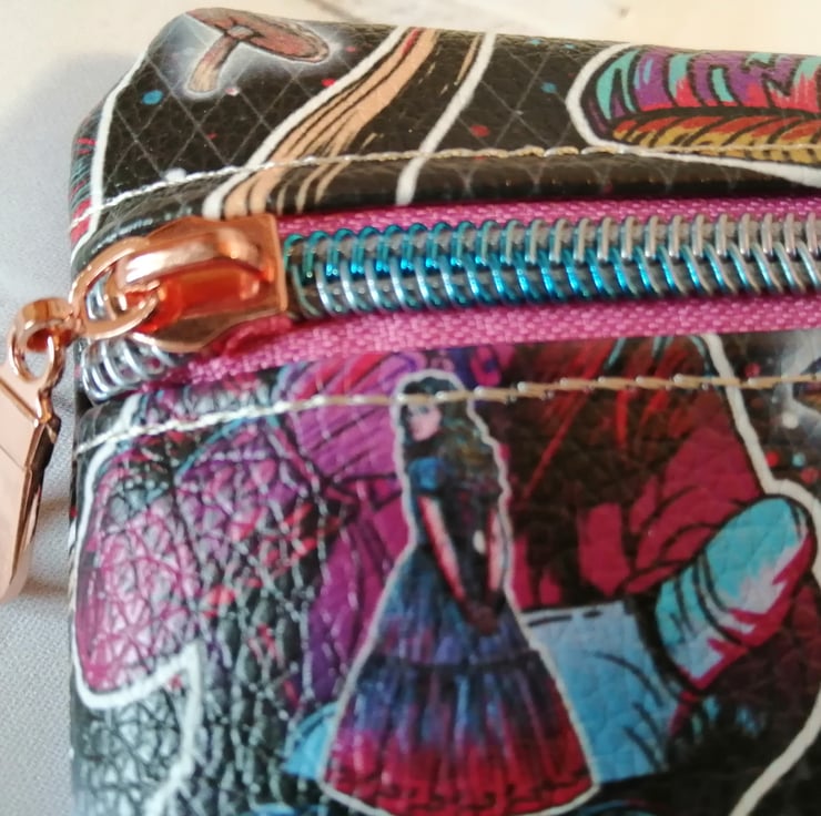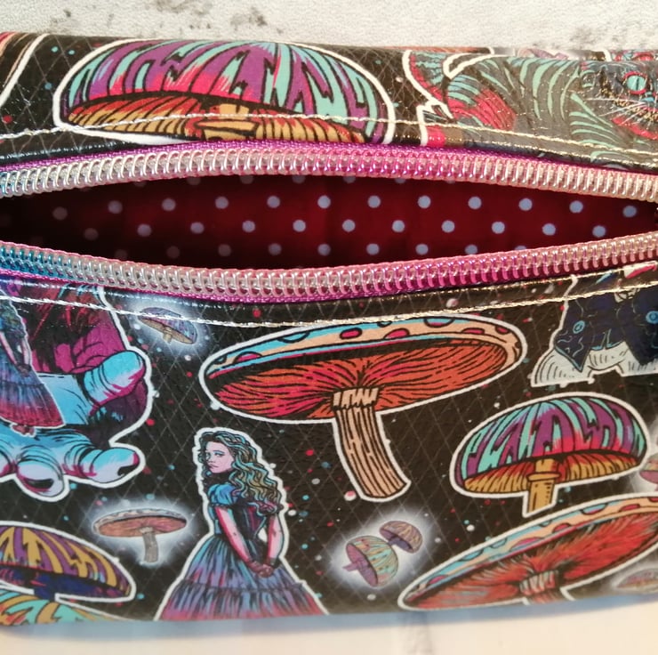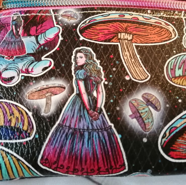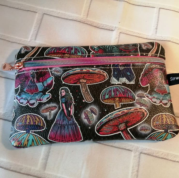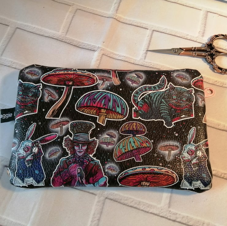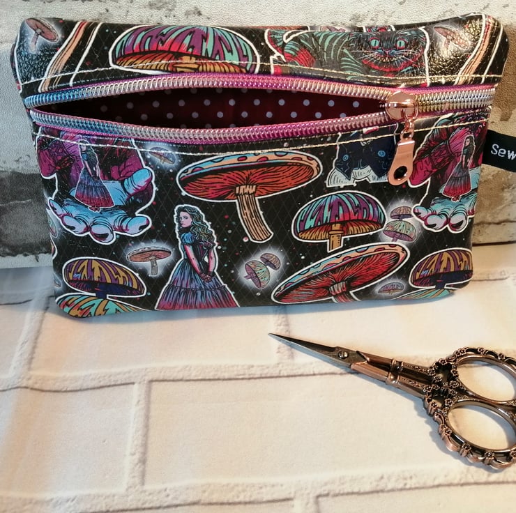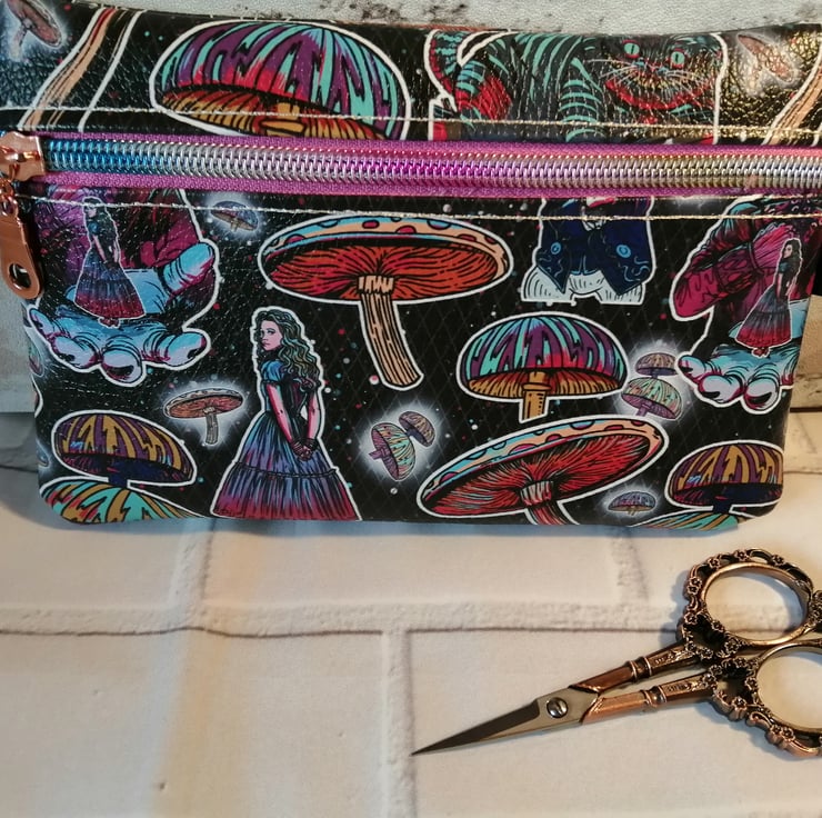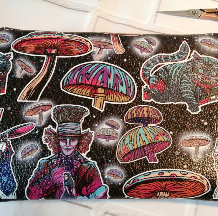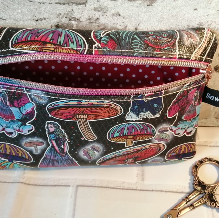 This fabulous make up cosmetic bag is made in a wonderful Alice in Wonderland themed vinyl. it is fully lined in a 100% cotton. It closes with a lovely rainbow zip. This pouch would make a lovely gift, or why not treat yourself.
