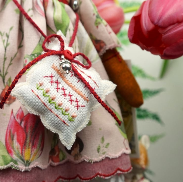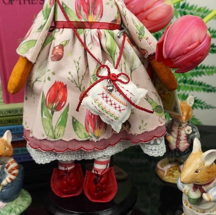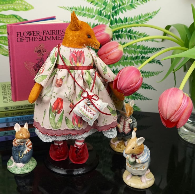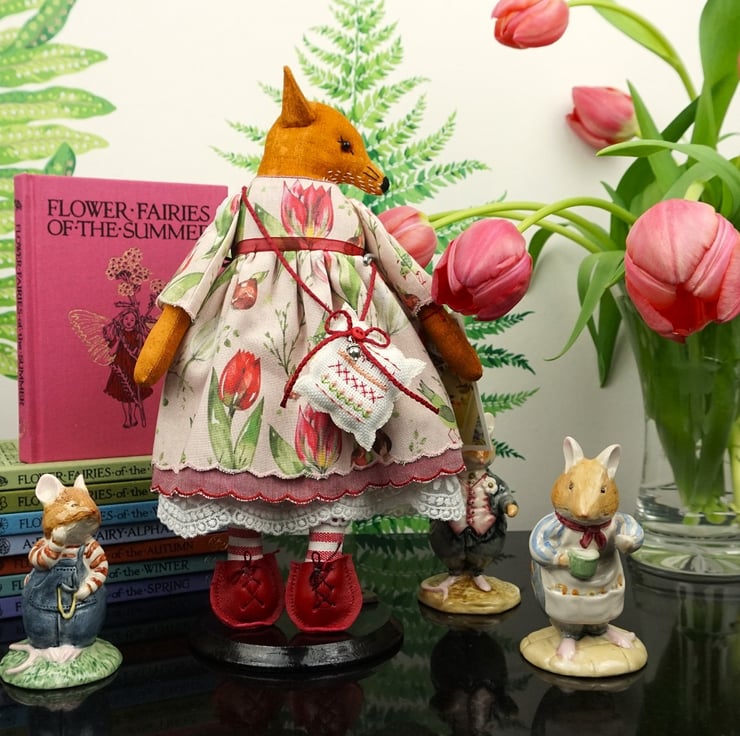 Tulip is a tiny vixen lady dressed in a lovely Acufactum print, with a pink ground with lots of tulips running across the fabric, the fabric is called Tulip Time. This print is just lovely with realistic paintings of beautiful tulip varieties. She has rosemary in her stuffing with a carnelian crystal to her heart, hand embroidered features and a little embroidered tail. She is finished with tiny buttons, organza ribbon and little leather shoes.