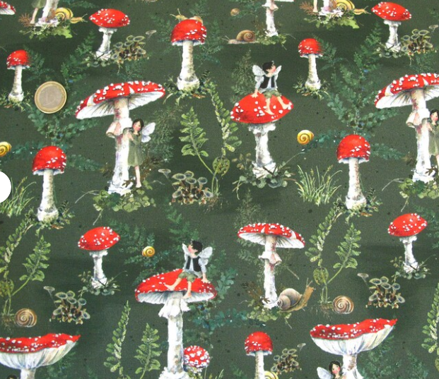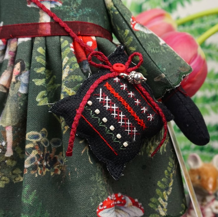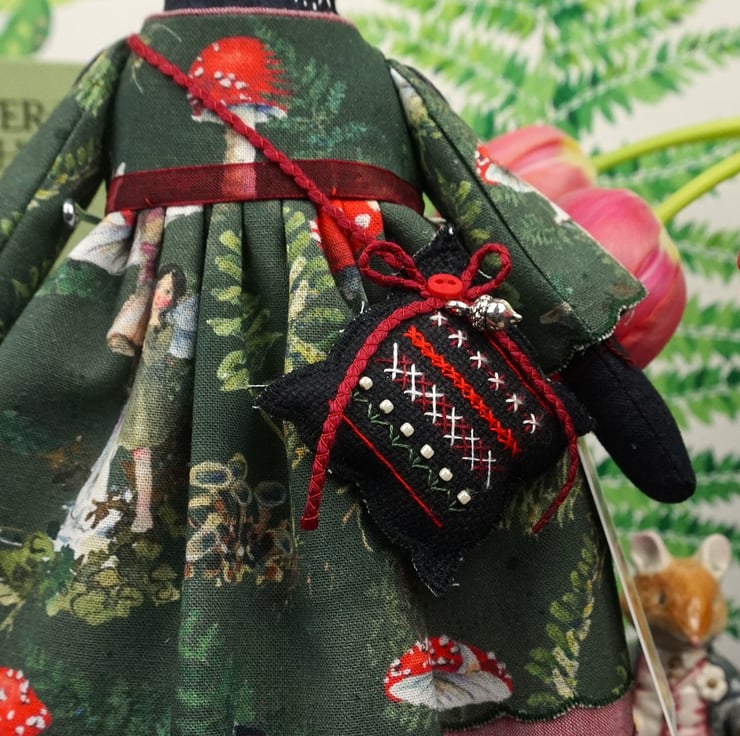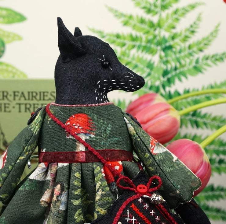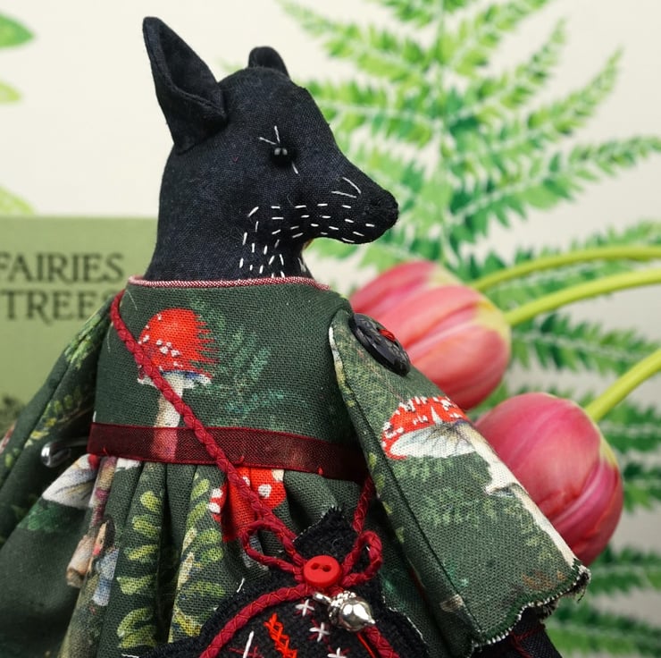 Elfi is a tiny vixen lady dressed in a lovely Acufactum print, with a forest green ground with lots of toadstools running across the fabric, the fabric is called Toadstools and Elves. This print is just lovely with amanita toadstools and tiny elves peeping. She has rosemary in her stuffing with an obsidian crystal to her heart, hand embroidered features and a little embroidered tail. She is finished with tiny buttons, organza ribbon and little leather shoes.