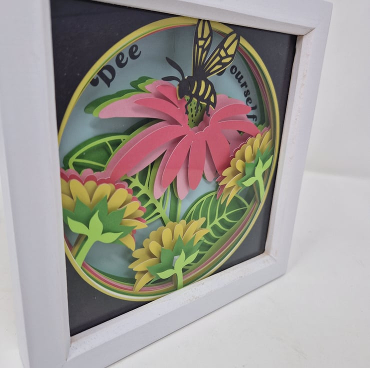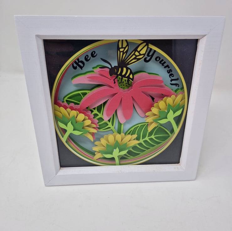 This is a handmade shadow picture in a solid wood frame. The frame measures 9cm square and the picture reminds us of the bees, how hard they work and how perfect they are just being themselves.