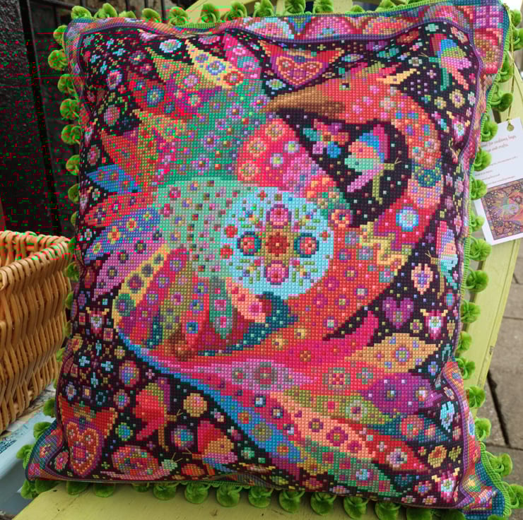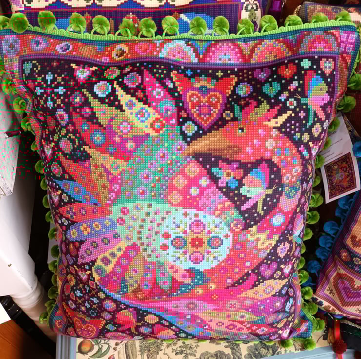 The fabric is a copy of one of my own tapestry kit designs. It's worked beautifully. I've added fabulous green pom-poms all around.