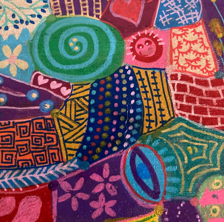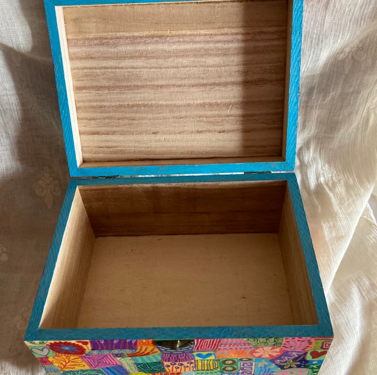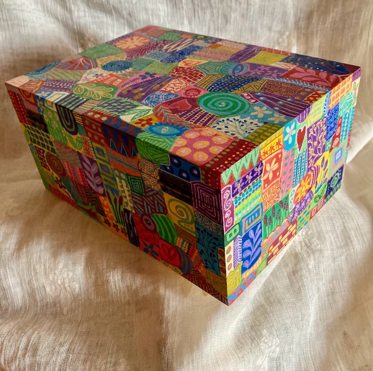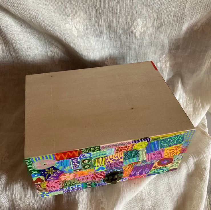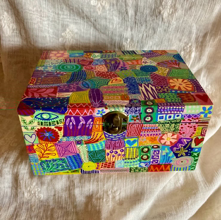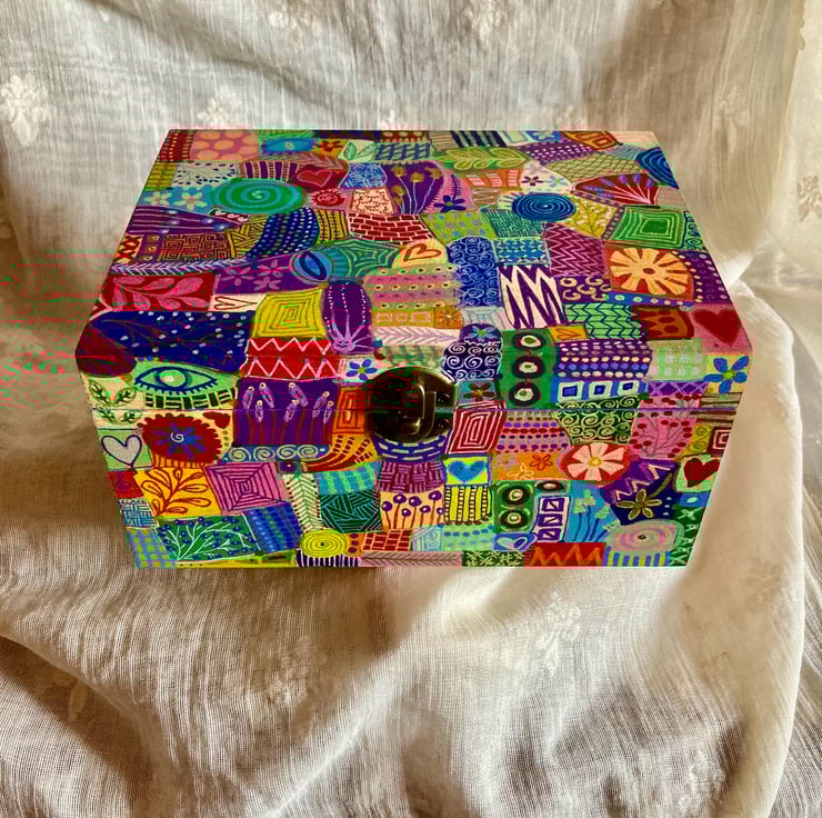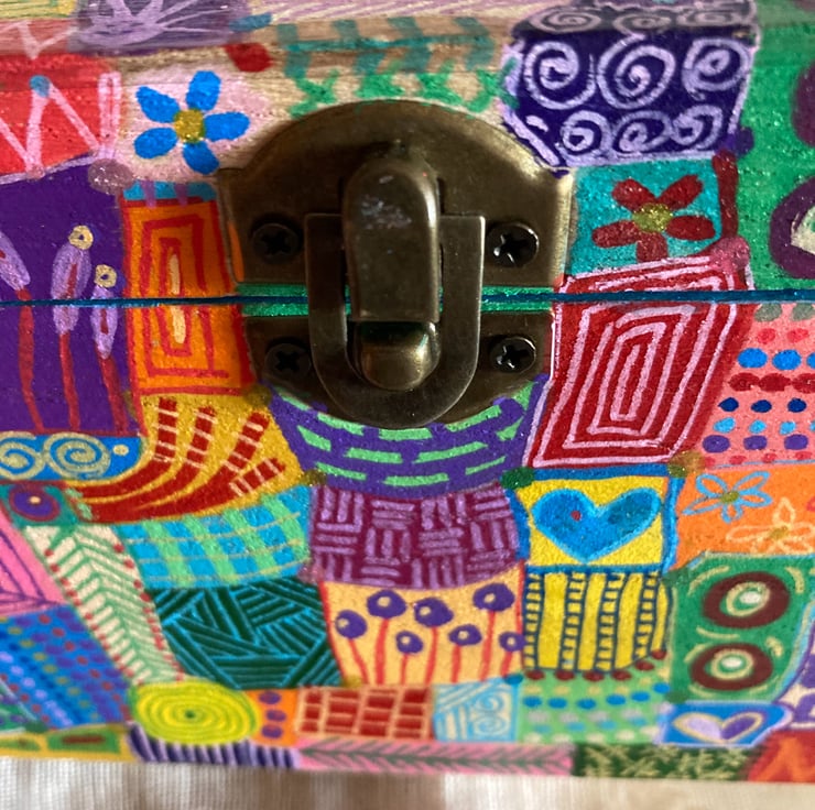 This wooden box has been hand painted in abstract doodles and varnished all over( inc inside )