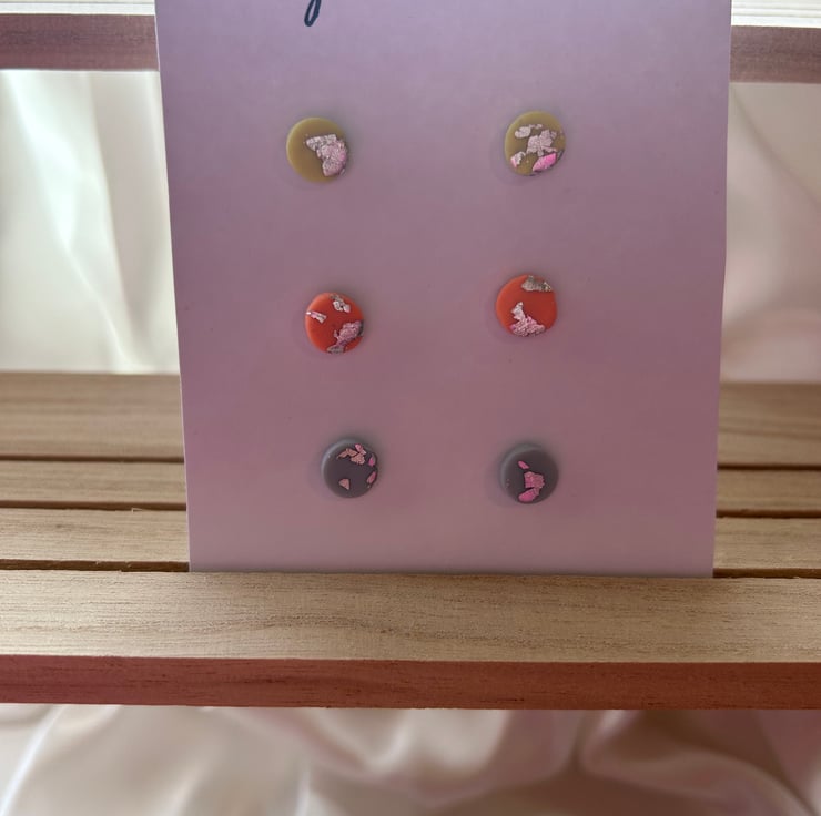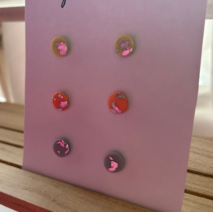 Lime green, orange & pale blue mini circle studs with silver leaf and a matt finish