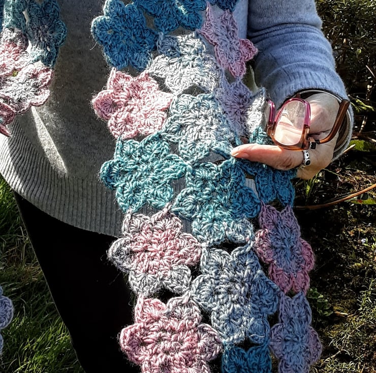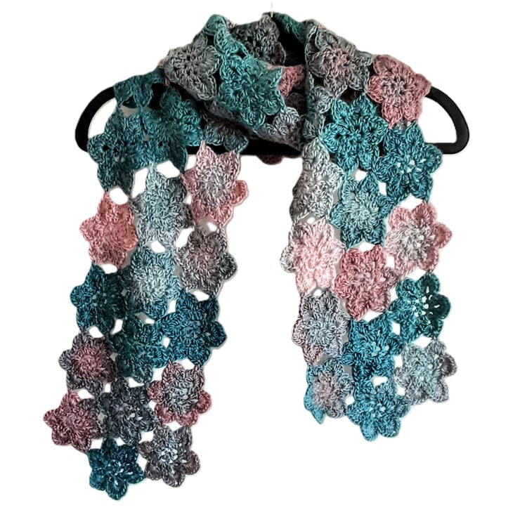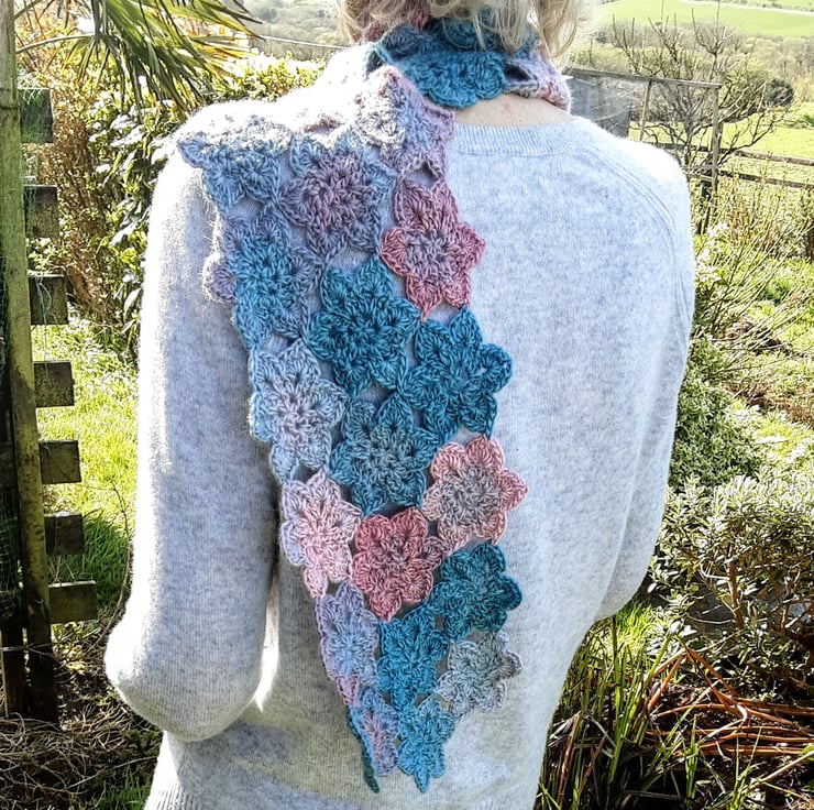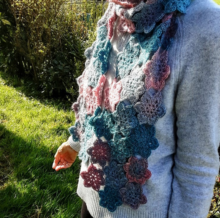 I have designed and crocheted this long and lovely scarf in a high quality acrylic and wool mix yarn making it fully washable in a cool wash by hand or machine. The colours range through light grey to turquoise then a pretty pink.