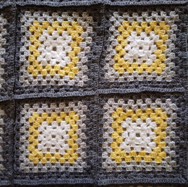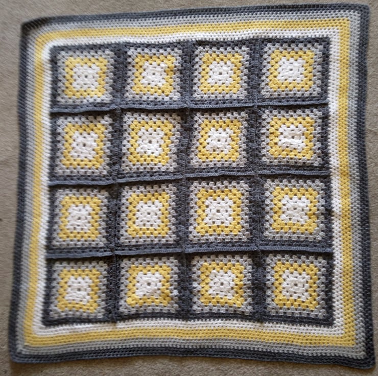 Crochet Granny Squares Baby Blanket or lap blanket in shades of grey and yellow. Suitable as a baby blanket or lap blanket. Handmade in soft baby wool. Measures 31 ins (79 cm) square. Machine washable.