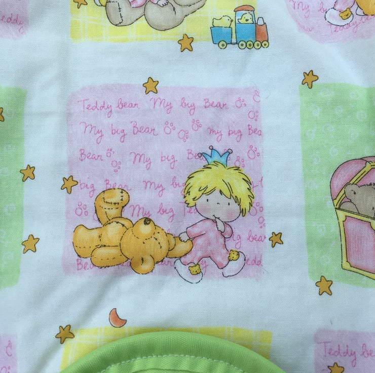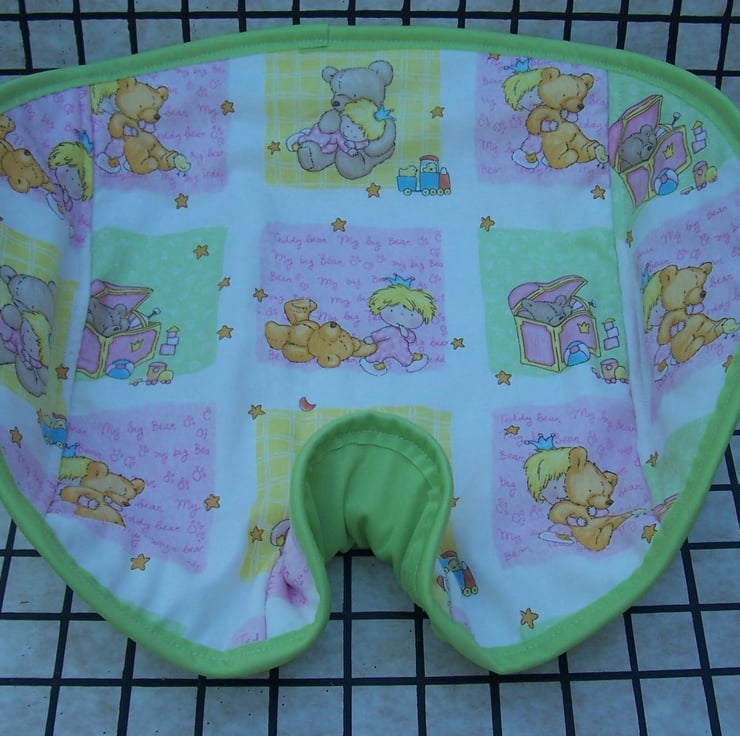 Made with PUL, a waterproof fabric, this seat cover will fit in a car seat, a push-chair, a feeding seat and will keep those things from being stained in the case of an accident when your toddler is being potty trained. The waterproof PUL fabric is the layer next to the car or pram seat, then a layer of towelling to mop up any leaks and the top layer is soft quilting cotton next to the skin.