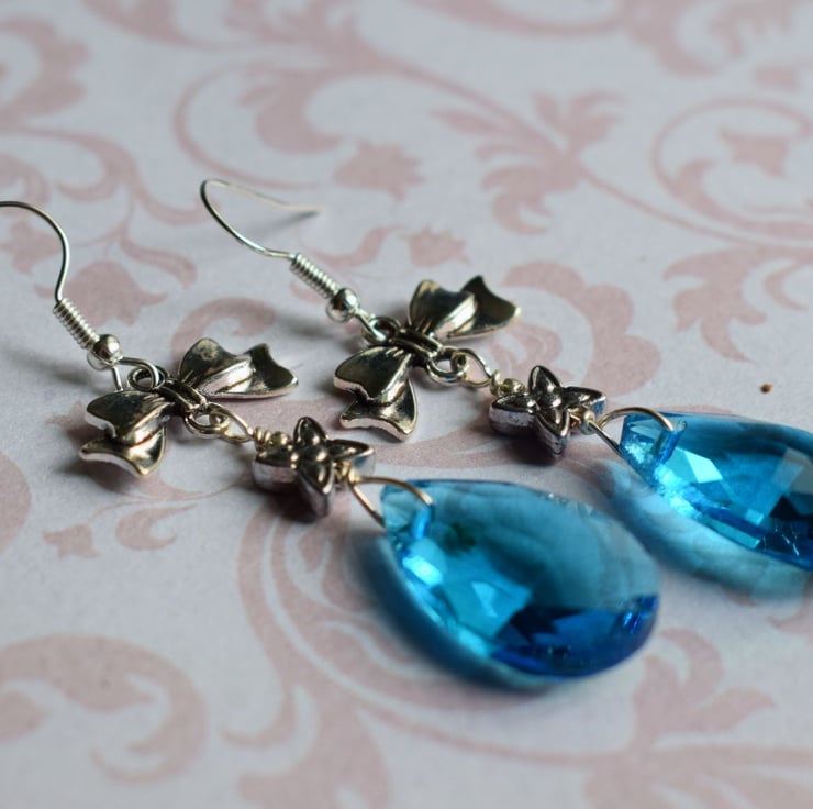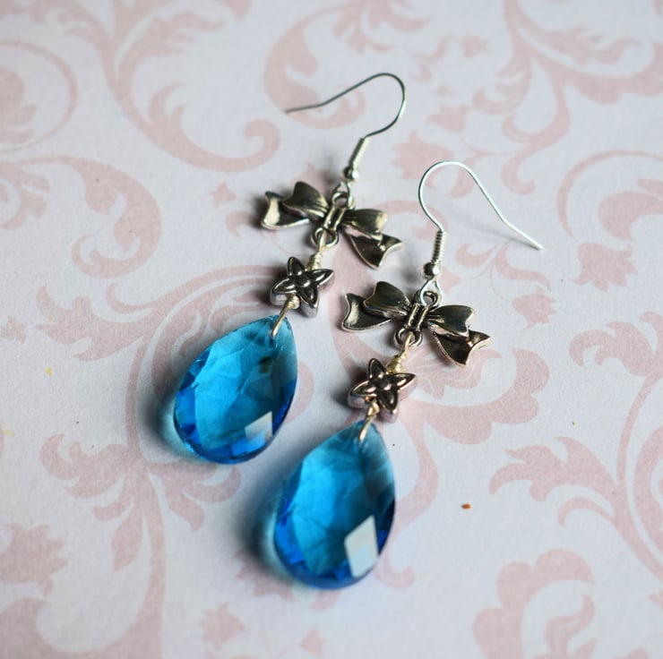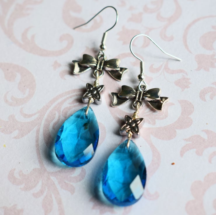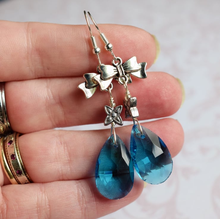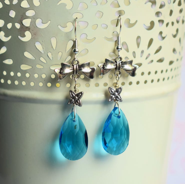 I have used some azure blue faceed glass teardrops for these earrings and paired them with some cross shaped Tibetan silver beads. They are then finished with some sweet bow connectors to complete the vintage vibe!