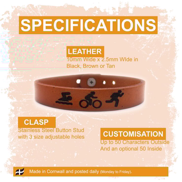Introducing our elegant Triathlon Bracelet, available in three stunning colours: brown, black, and tan, with the Swim, Bike, Run icons on the front. Crafted from high-quality leather, this bracelet is the perfect accessory for any triathlon enthusiast.