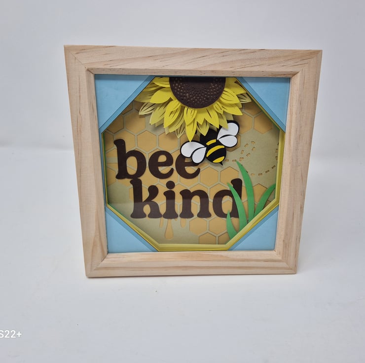 Pretty 3d shadow box with the message 'Bee Happy'. Matches others in the series in my shop. Made of pine glass and card, it's very attractive and comes gift wrapped. I combine postage. Measures 19cm x 19cm