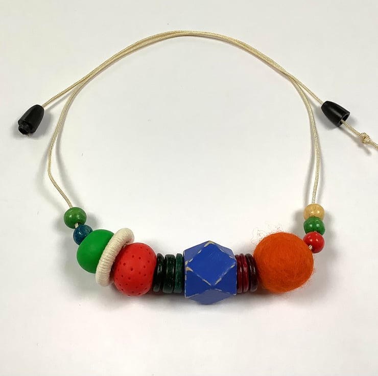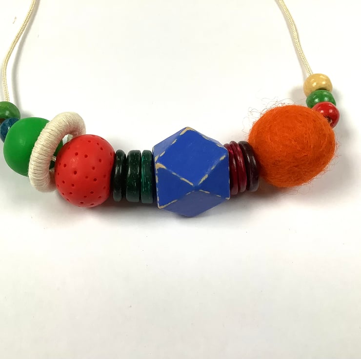 The necklace comprises wooden, felt and polymer clay beads plus a cotton covered metal ring. The largest bead is 2cm.