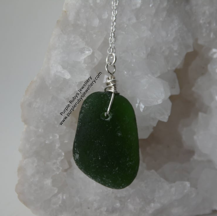 A beautiful chunkier piece of frosted deep green Lyme Regis, Dorset sea glass wire wrapped with silver wire.