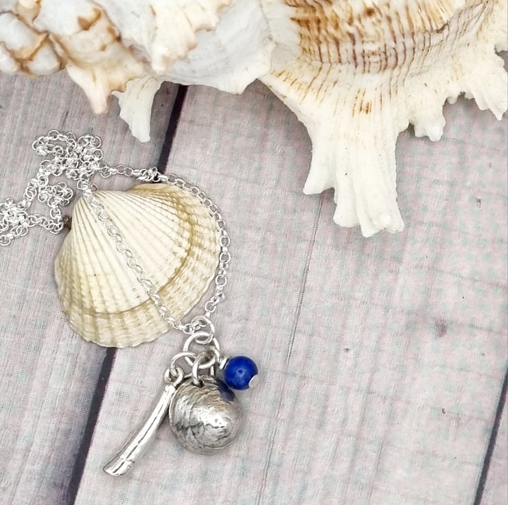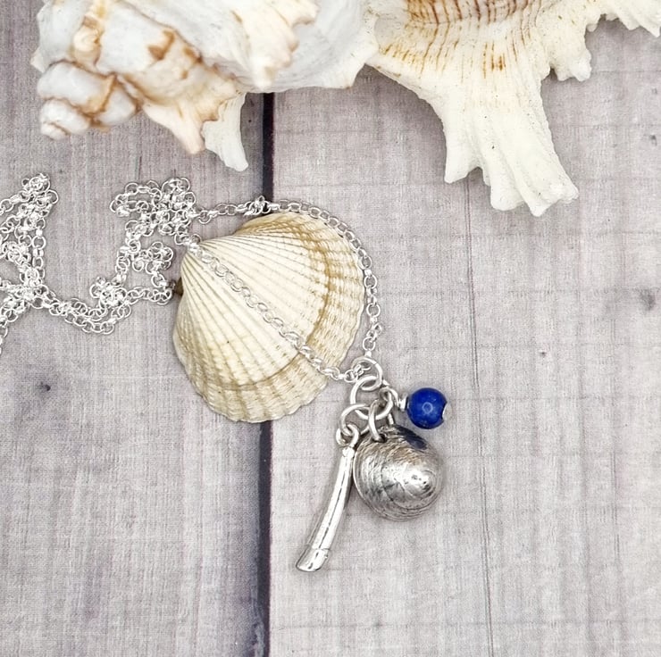 This necklace features a real Top seashell and a real tusk seashell covered in silver and a lapis lazuli gemstone bead, supplied on 18" sterling silver chain.