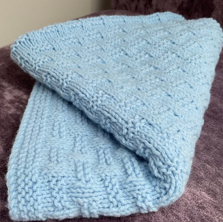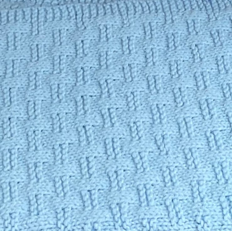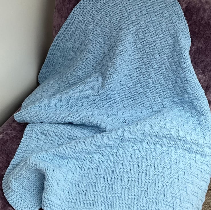 Pastel Blue baby blanket, hand knitted in a basket weave design.