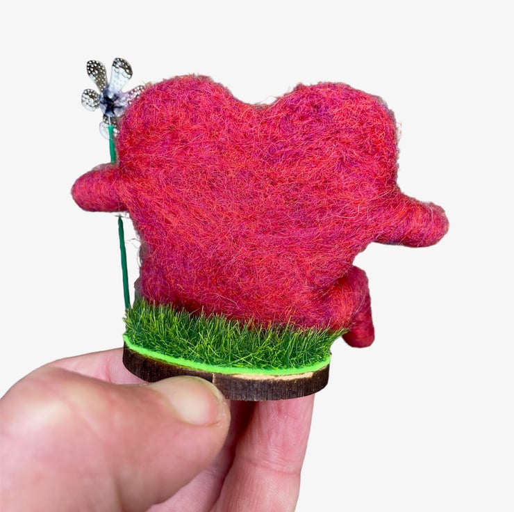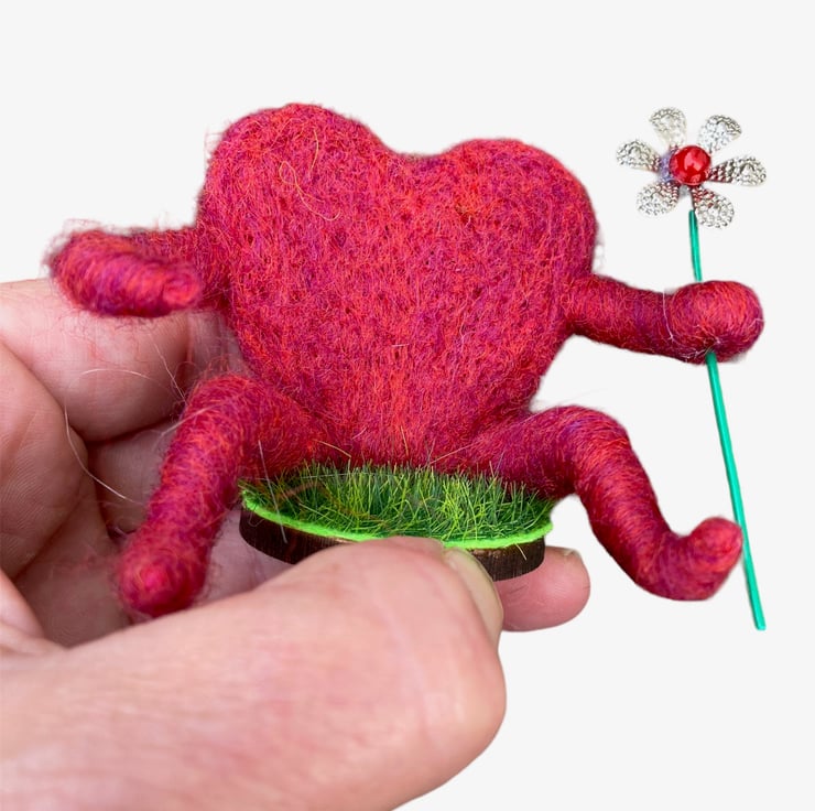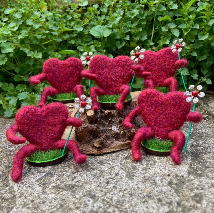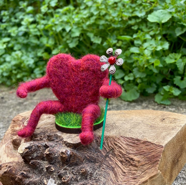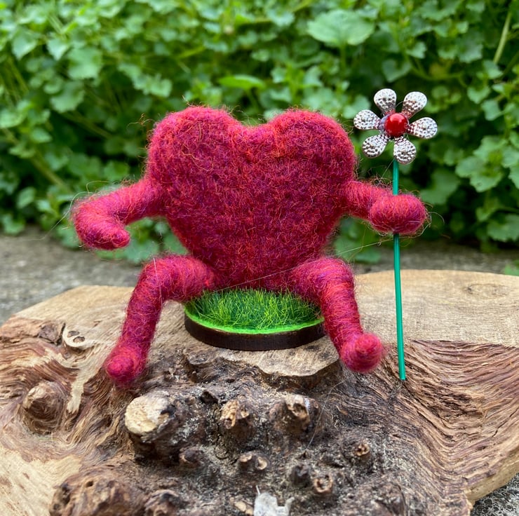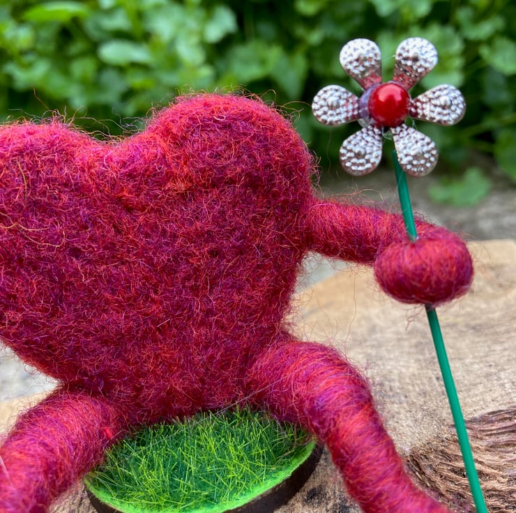 Send someone a hug. This heart hug has been needle felted using red Corriedale woollen fibres. The arms and legs are made over a wire former making them gently posable. Each heart is holding a small flower stem made using silver coloured petals with a red acrylic half pearl centre. The heart has been mounted on a small wooden disc covered in artificial grass.