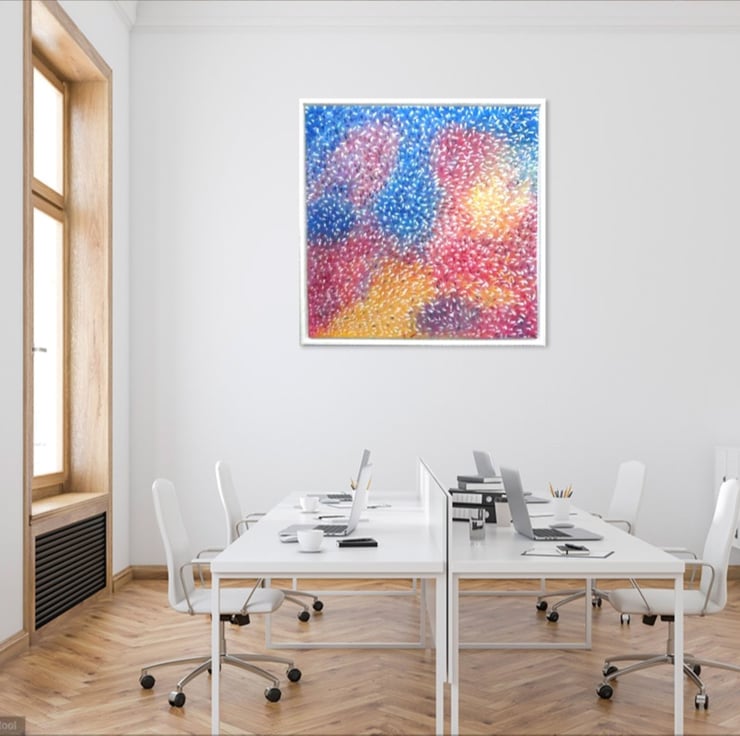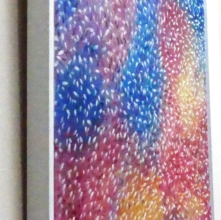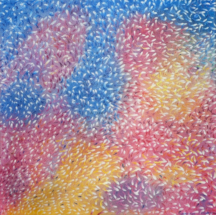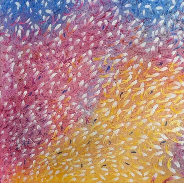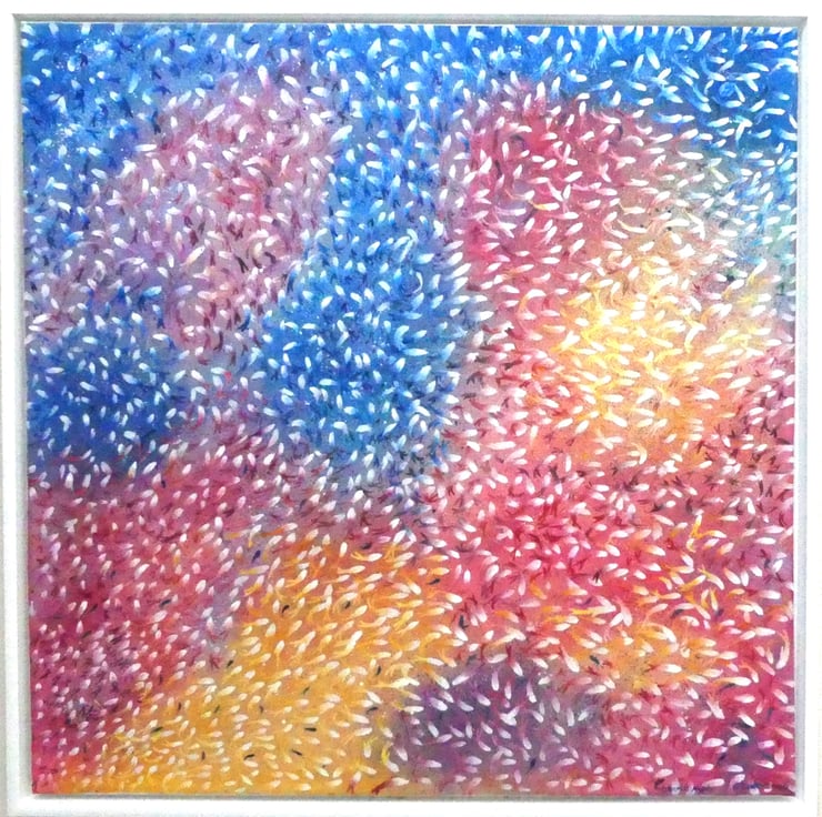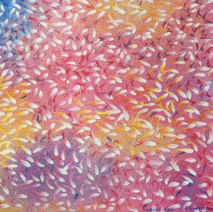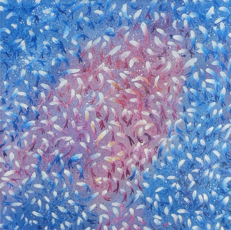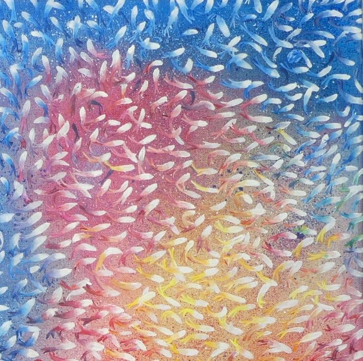 This is a painting of multiple layers, the abstract background of several layers was laid in originally, and after a 3-week drying time each fish was painted in white, allowed to dry over several weeks then finally individually shaped and coloured to mirror the background colours … the 3D result creates a myriad of activity seemingly swirling off the canvas