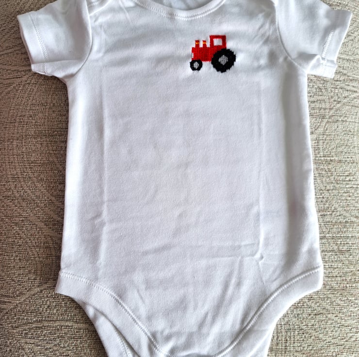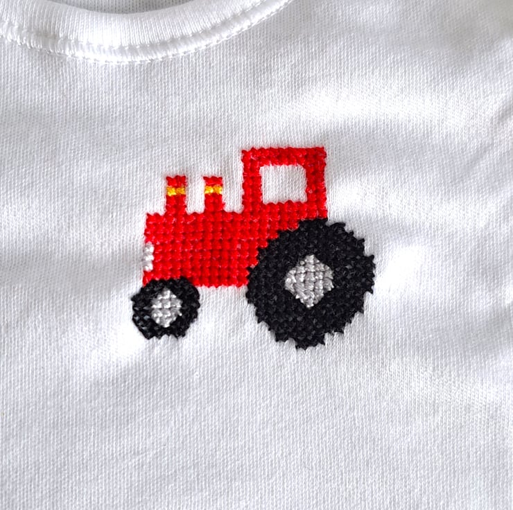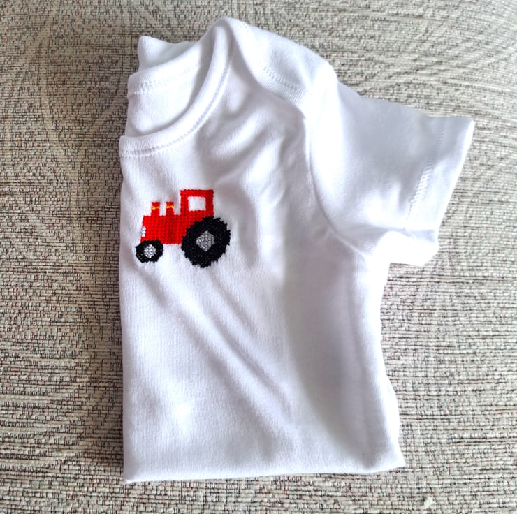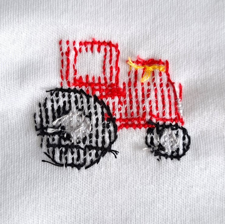 This is a lovely soft white cotton vest/onesie, with short sleeves, an envelope neck and three press studs between the leg openings. I have hand embroidered a red tractor on the front. As I never use a permanent backing material when embroidering kid's clothing, there is nothing inside the garment to irritate your child's skin. The vest can be machine washed.