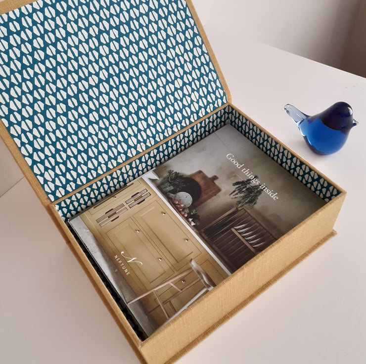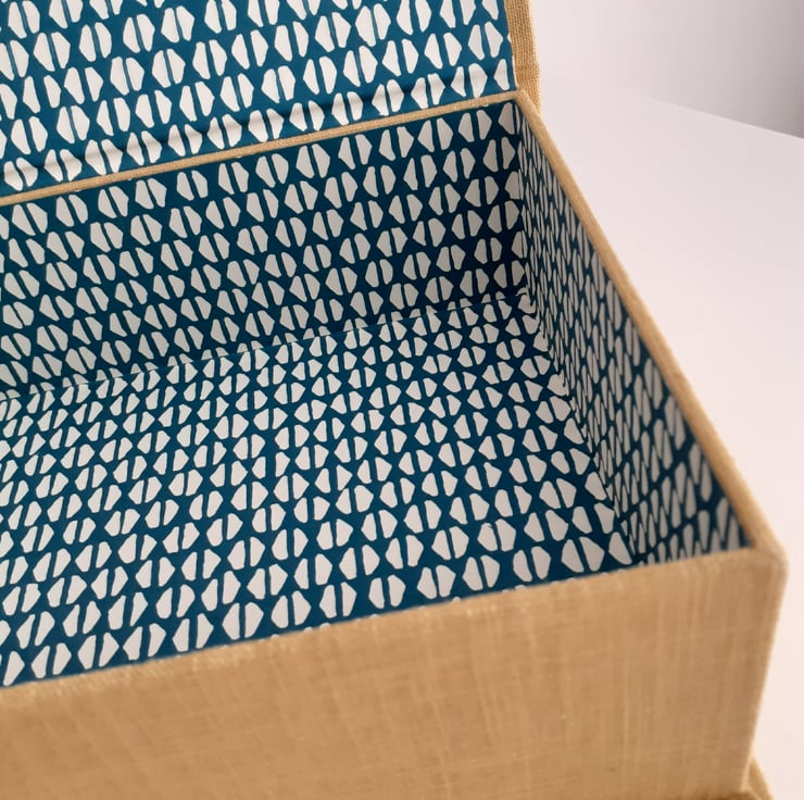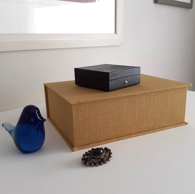 The fabric on this box is a fine, natural linen in a sophisticated ochre colour.