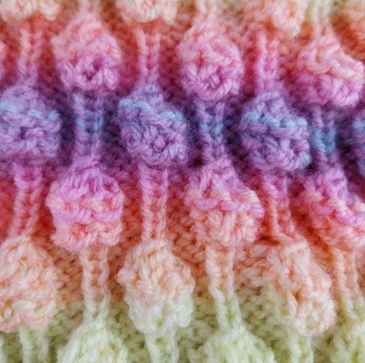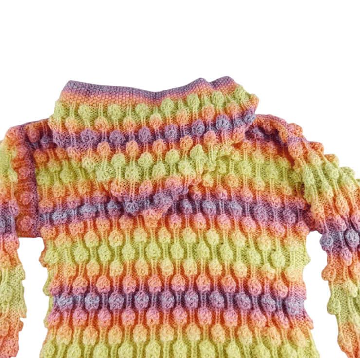 This hand-knitted pastel rainbow cardigan is perfect for girls aged 6-7 years! Designed with a cosy hood and charming bobble texture, it's both stylish and practical for chilly days.