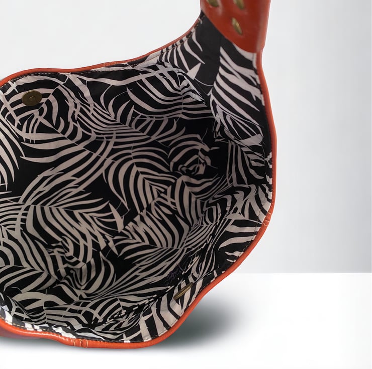 The bag's interior boasts a lining of black and white cotton, adding a touch of elegance that harmonizes beautifully with the striking leather exterior. Its slight slouch lends a relaxed yet chic vibe, making it an ideal companion for your everyday adventures.