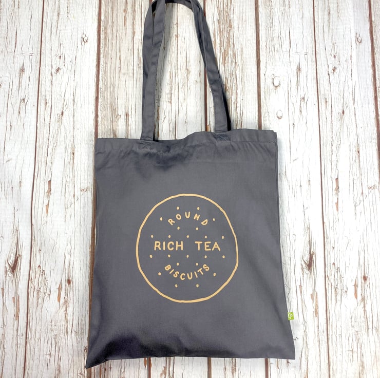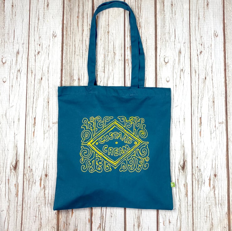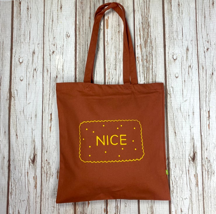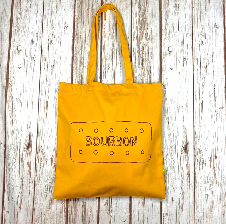 We have four delicious biscuits to chose from to take with you on your daily biscuit shop. The biscuits are four of the classics- Custard Cream, Digestive, Rich Tea, Nice and Bourbon. The Custard Cream and Nice are in yellow flock, if you'd like these designs on the mustard yellow bag you can request we use cream flock. The Rich Tea is in cream flock and the Bourbon in brown flock (again we can change to cream flock if you'd like the terracotta brown bag).