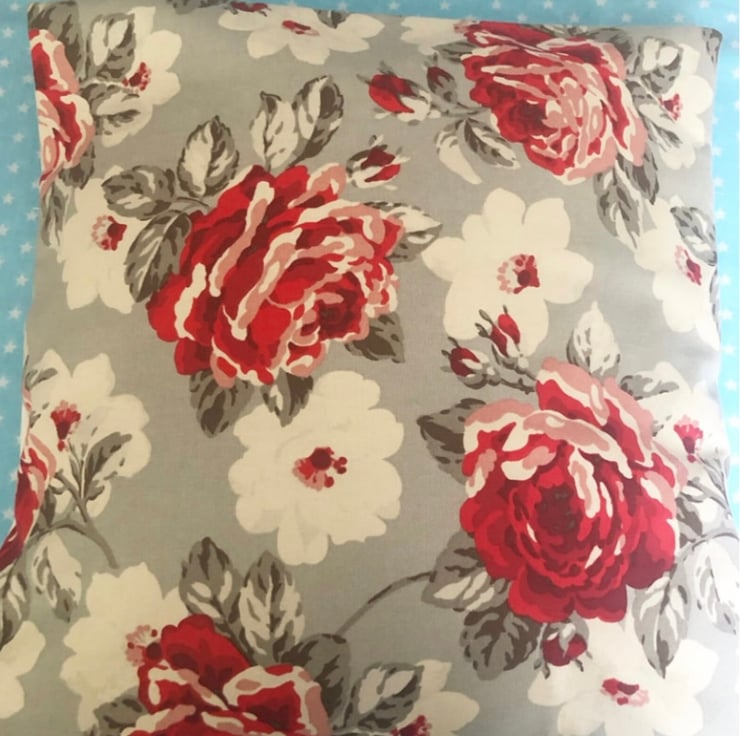 Gorgeous cushion cover made with Cath kidston fabric for the front with a white cotton back with an envelope opening. It measures 16 “ x 16”