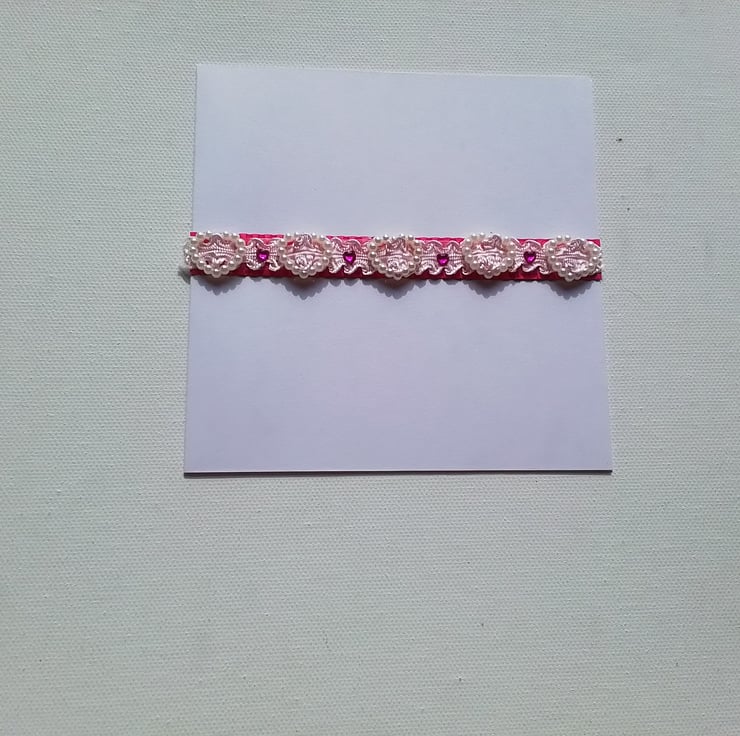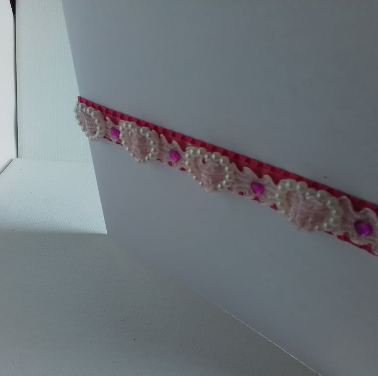 A pretty card with white beaded hearts and tiny cerise hearts which are on a band of pink lace ribbon and cerise corrugated card strip.