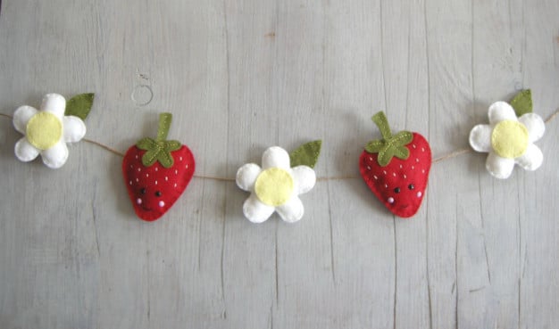 Make and sew a cute felt strawberry and flower garland with this sewing kit. The kit would be a great gift for someone crafty or just a treat for yourself and once it is made brighten up your home with this happy garland. Can be made into individual decorations if you prefer.