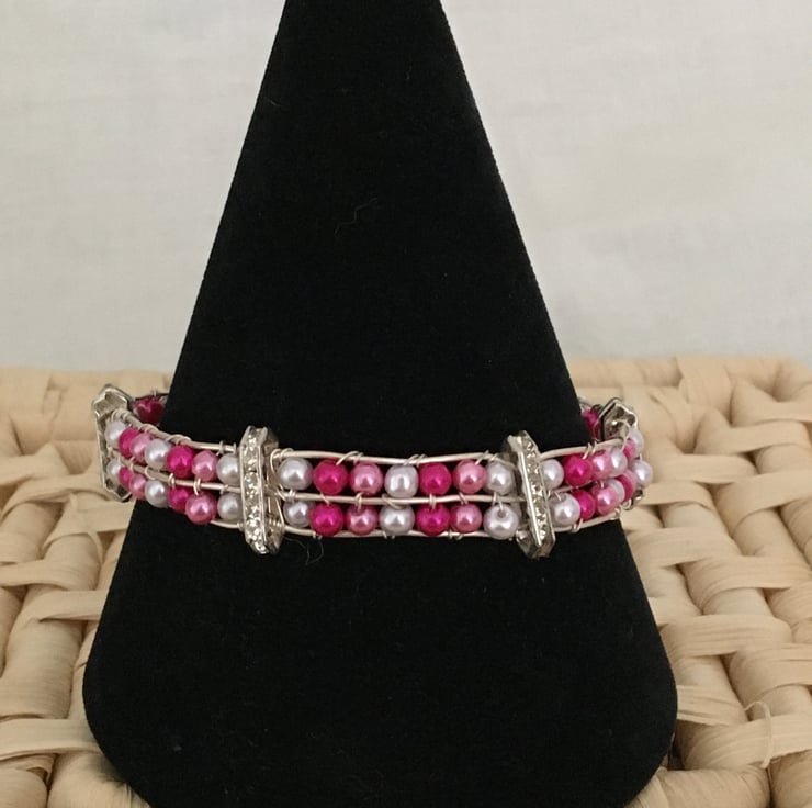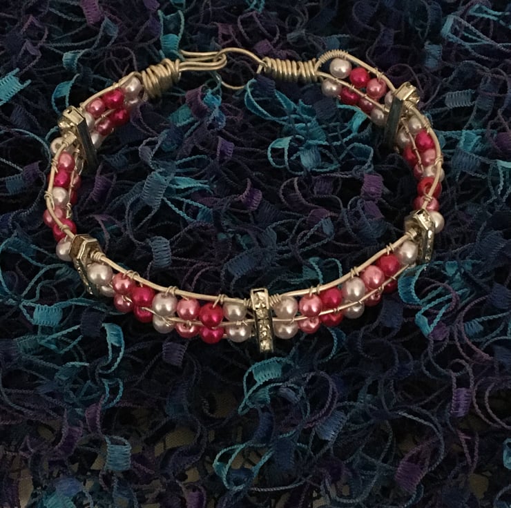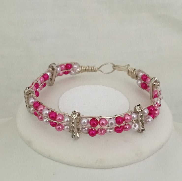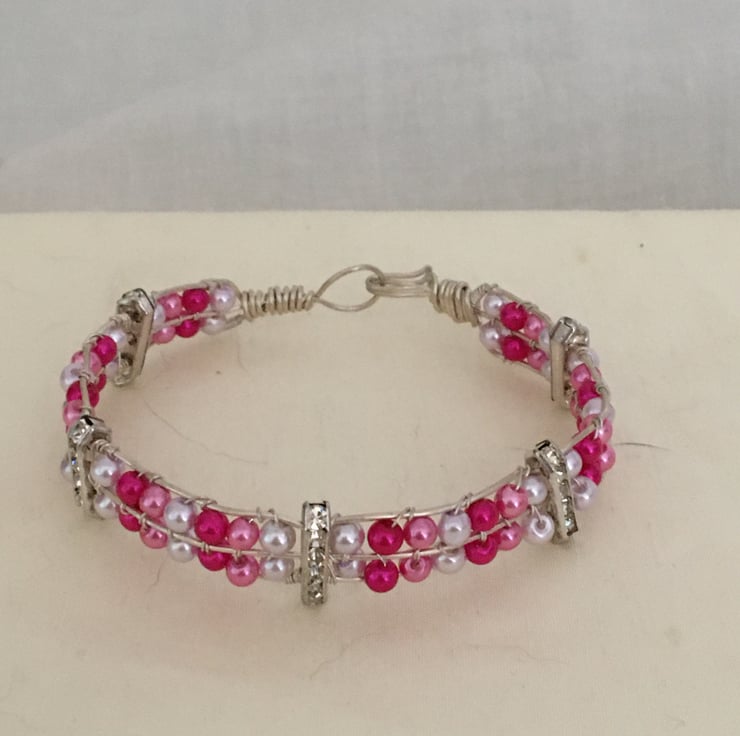 A handmade wirework bangle with pretty pink and white glass beads and glass crystal dividers. The bangle fits a 7.5 ins wrist comfortably but no larger and fastens with a hook. The bangle you will receive is the one in the photos.