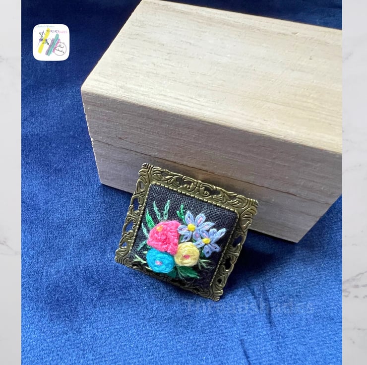 Rose and floral design embroidery on black linen fabric. Used DMC embroidery threads for embroidery. Antique bronze vintage style brooch base is giving very beautiful look. Roses and other flowers design is evergreen and admired!