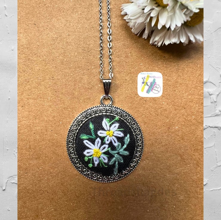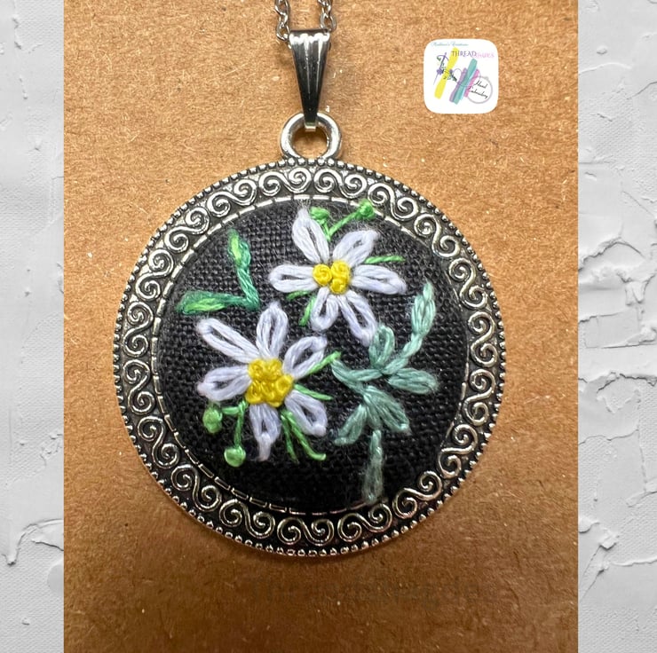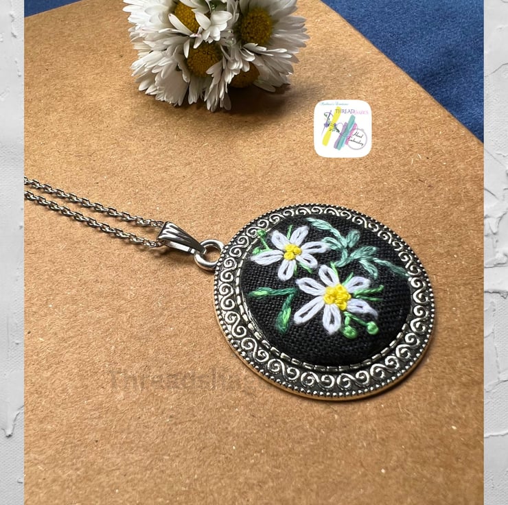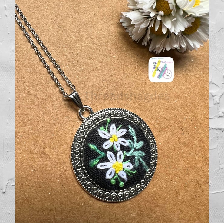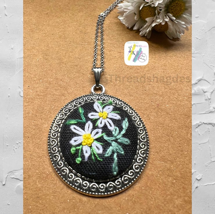 Description:- It is beautiful antique silver colour hand embroidered pendant with daisy floral embroidery. Ideal for gifting or add to your jewellery collection. Embroidered on linen fabric with DMC cotton embroidery threads. I try to make each pendant unique by using different colour combinations and motifs. Ready to dispatch .