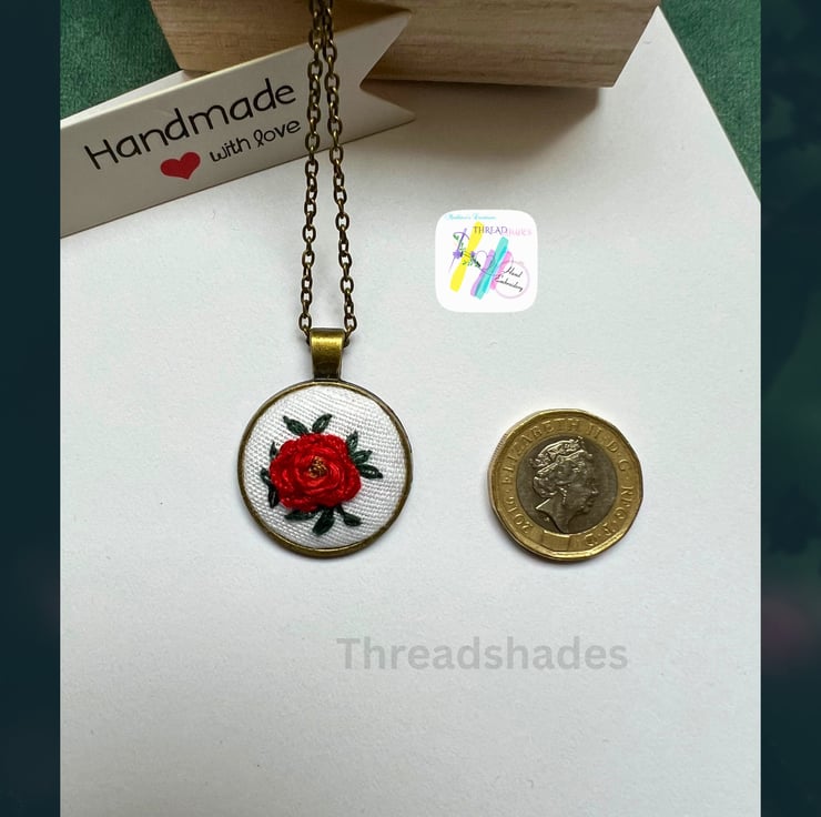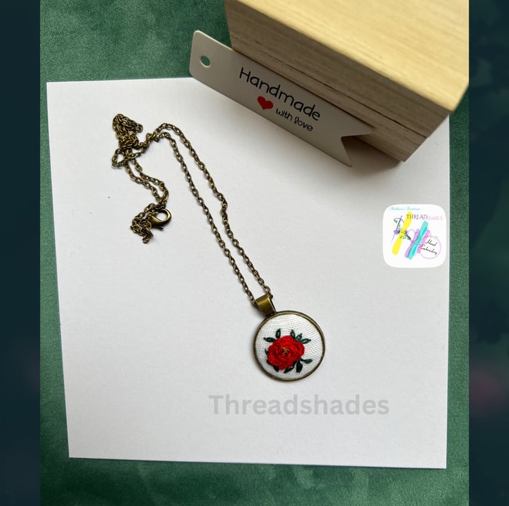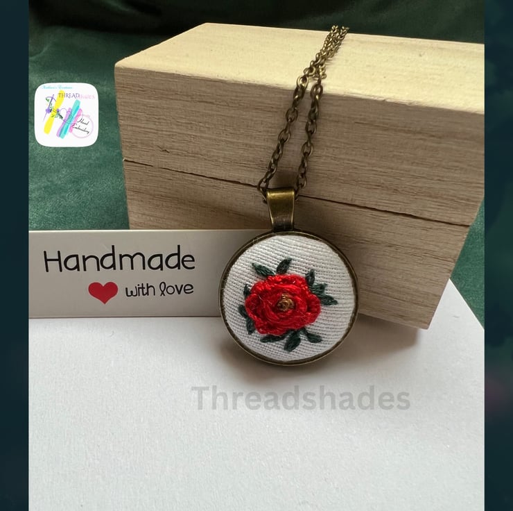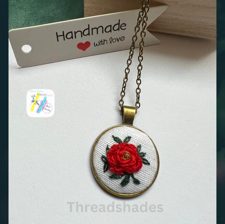 Description:- It is beautiful antique bronze hand embroidered pendant with red rose and embroidery. Ideal for gifting or add to your jewellery collection. Embroidered on linen fabric with DMC cotton embroidery threads. Ready to dispatch .